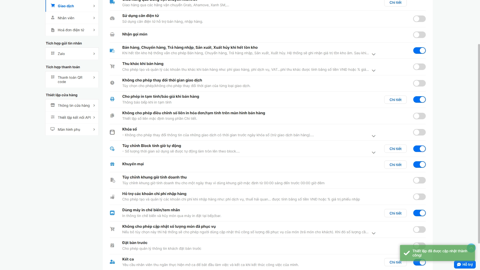 - Vào mục Thiết lập (biểu tượng bánh răng) -> Thiết lập cửa hàng -> tab Giao dịch.