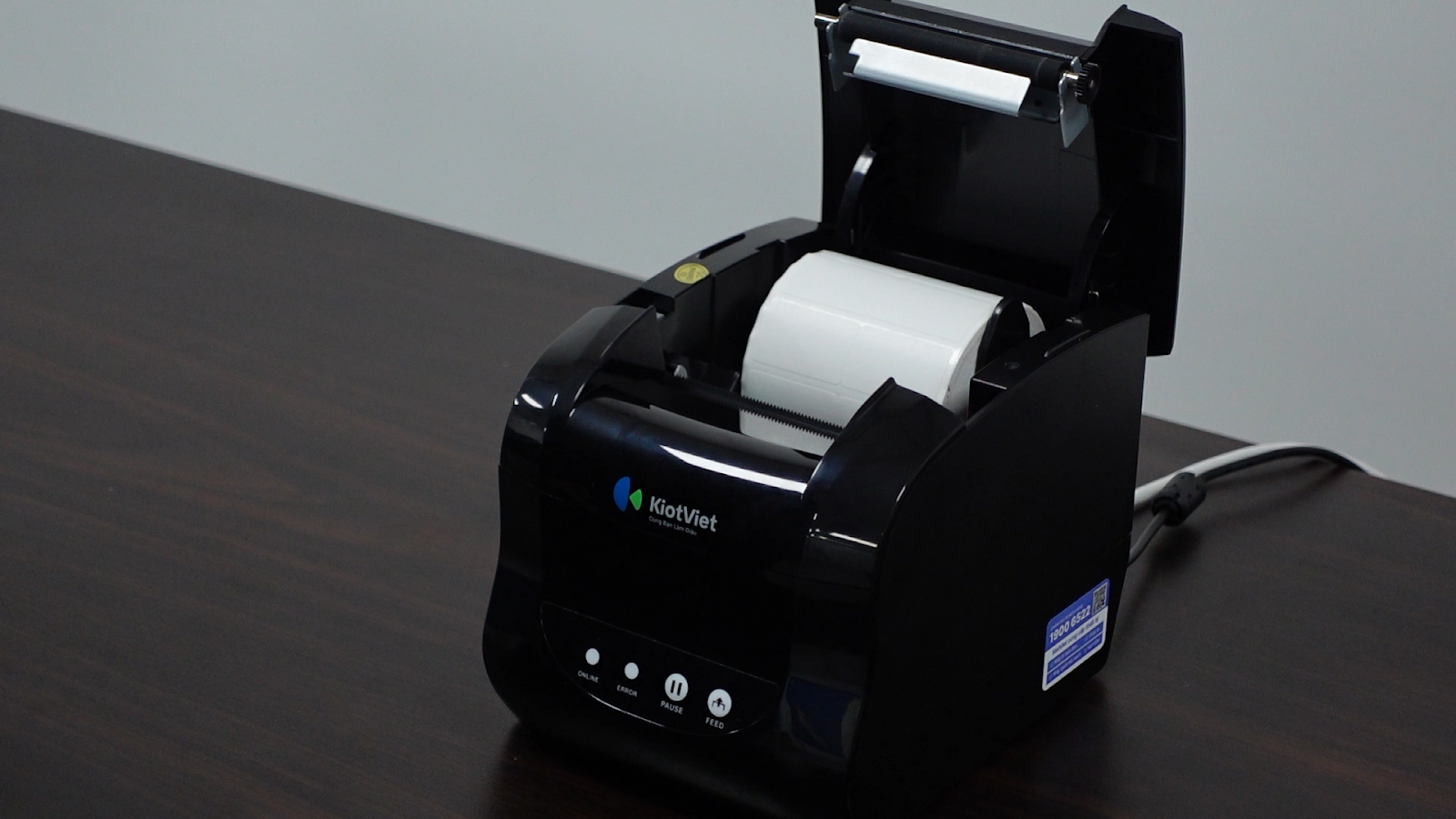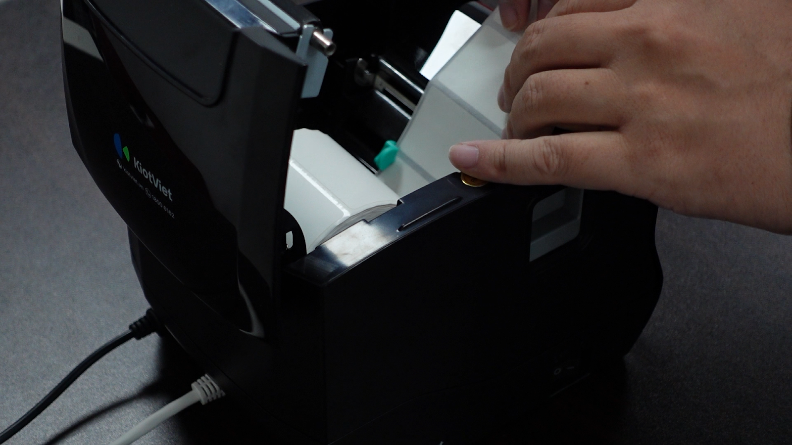 - Mở nắp máy in, đặt cuộn giấy tem vào thanh đỡ sao cho mặt tem hướng lên trên.