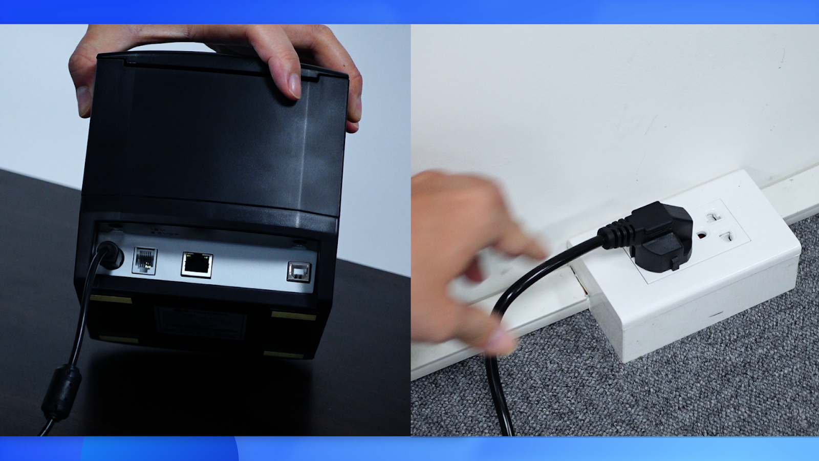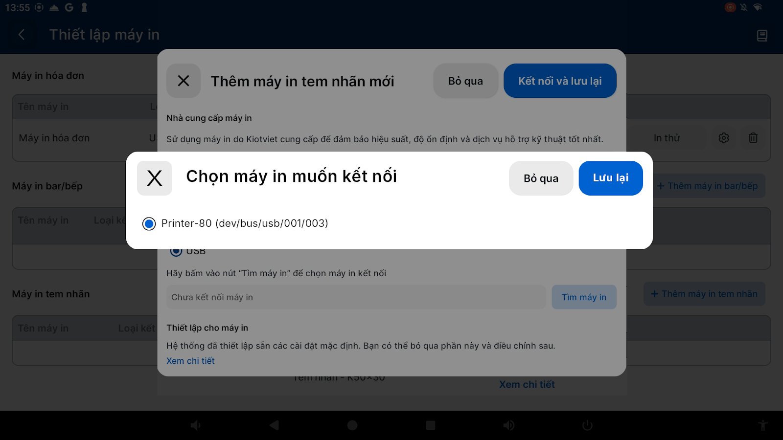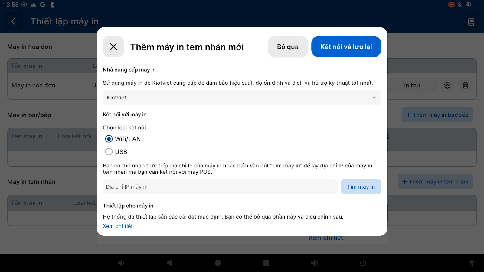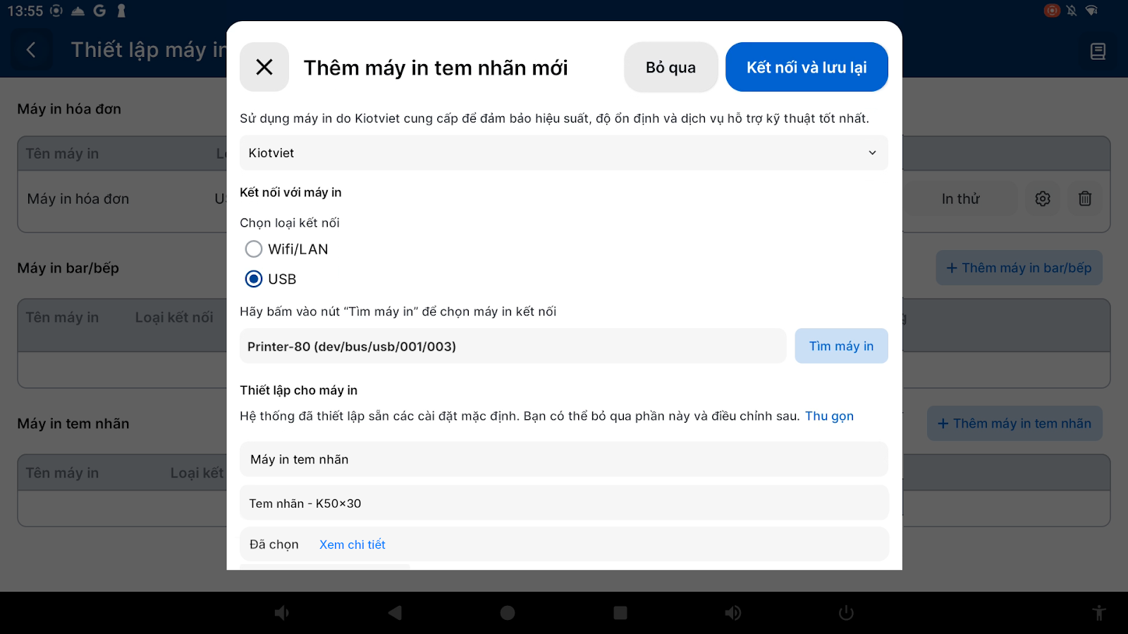 - Tình huống: Sau khi đã bật thiết lập nền, bạn cần kết nối máy POS với máy in tem qua cổng USB hoặc mạng LAN.