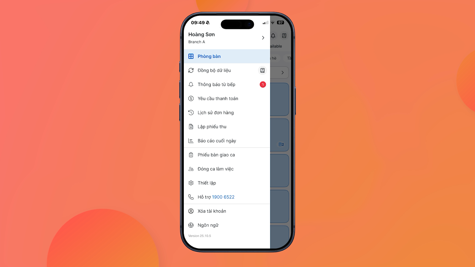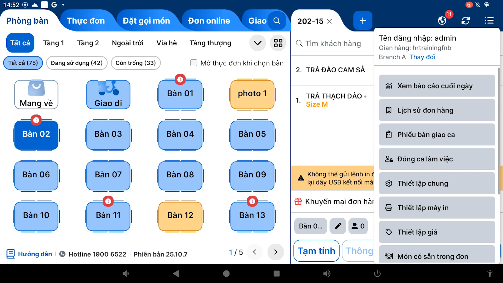- Thao tác thực hiện như sau: Nhân viên không cần cài đặt gì thêm trên điện thoại. Khi họ bấm Thông báo, lệnh in sẽ tự động được chuyển đến máy tính để xử lý. (Lưu ý: Ở kịch bản này, bạn phải TẮT tùy chọn “Cho phép in bar, bếp trực tiếp từ điện thoại” theo hướng dẫn ở Phần II).