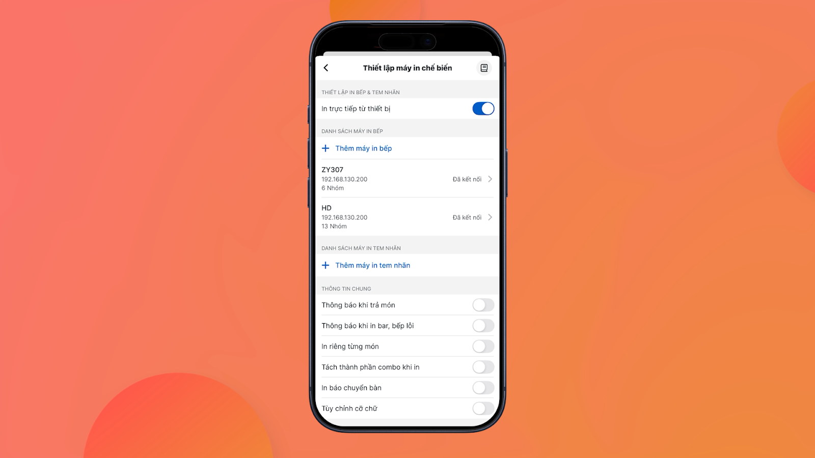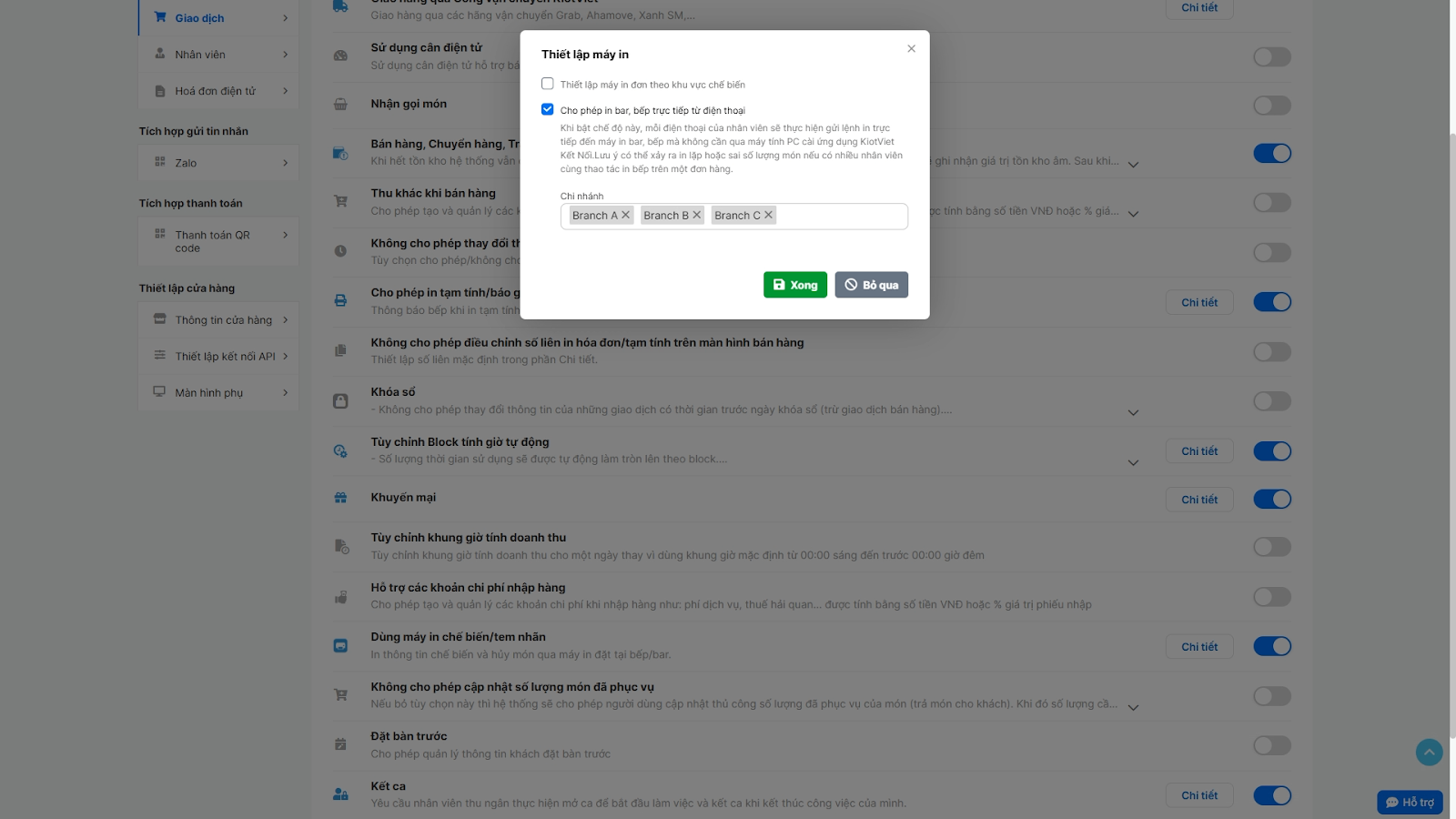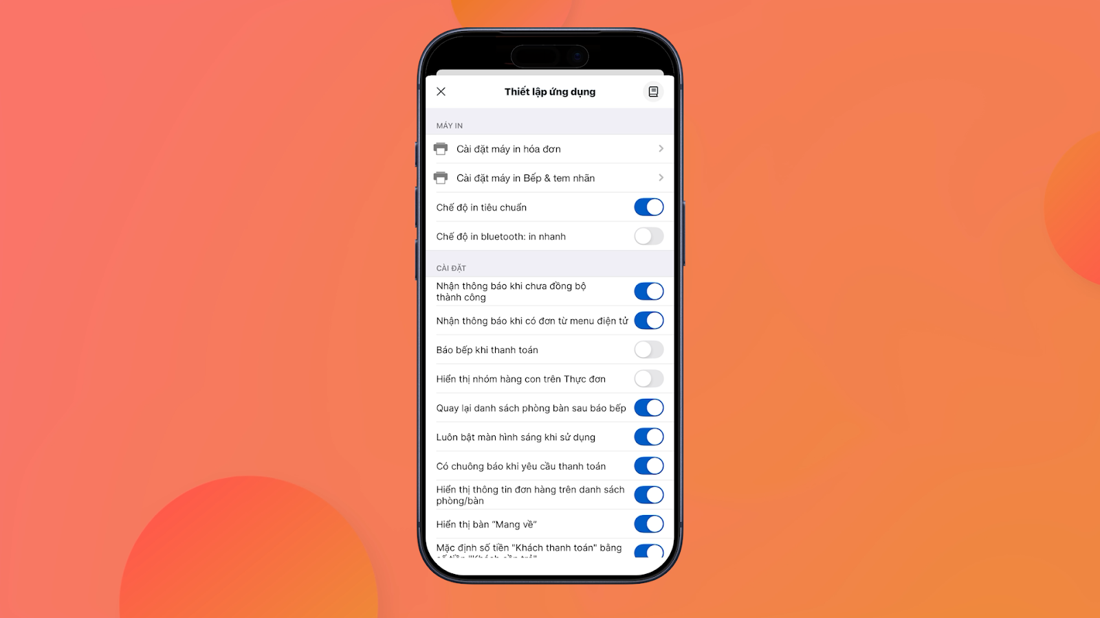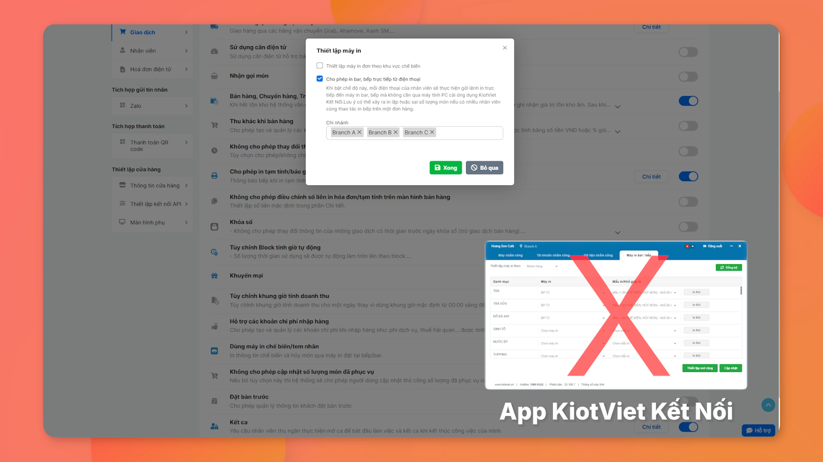- Quan trọng: TẮT tùy chọn “Cho phép in bar, bếp trực tiếp từ điện thoại”.
