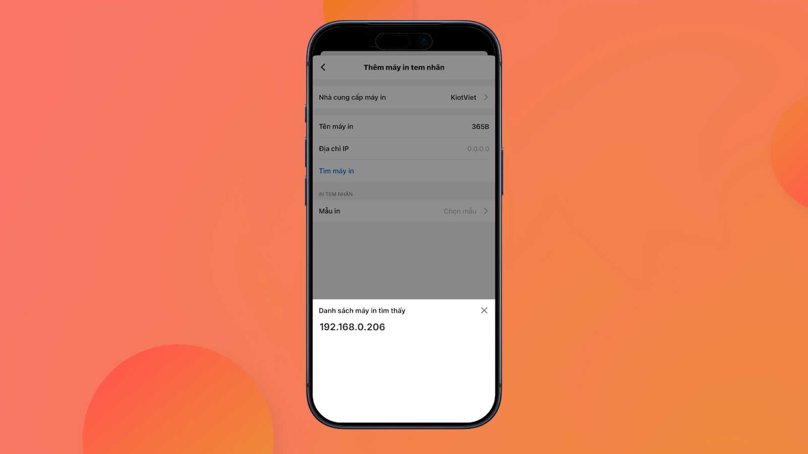 - Nhấn Tìm máy in để quét và chọn đúng IP của máy in tem.