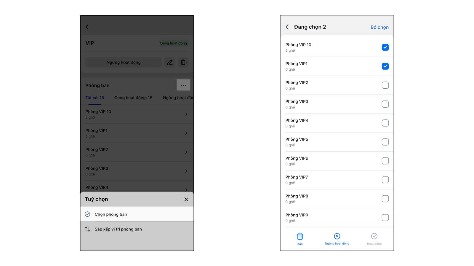- Tích chọn các phòng bàn cần thao tác → chọn thao tác cần thực hiện: Xóa/ Ngừng hoạt động/ Hoạt động.