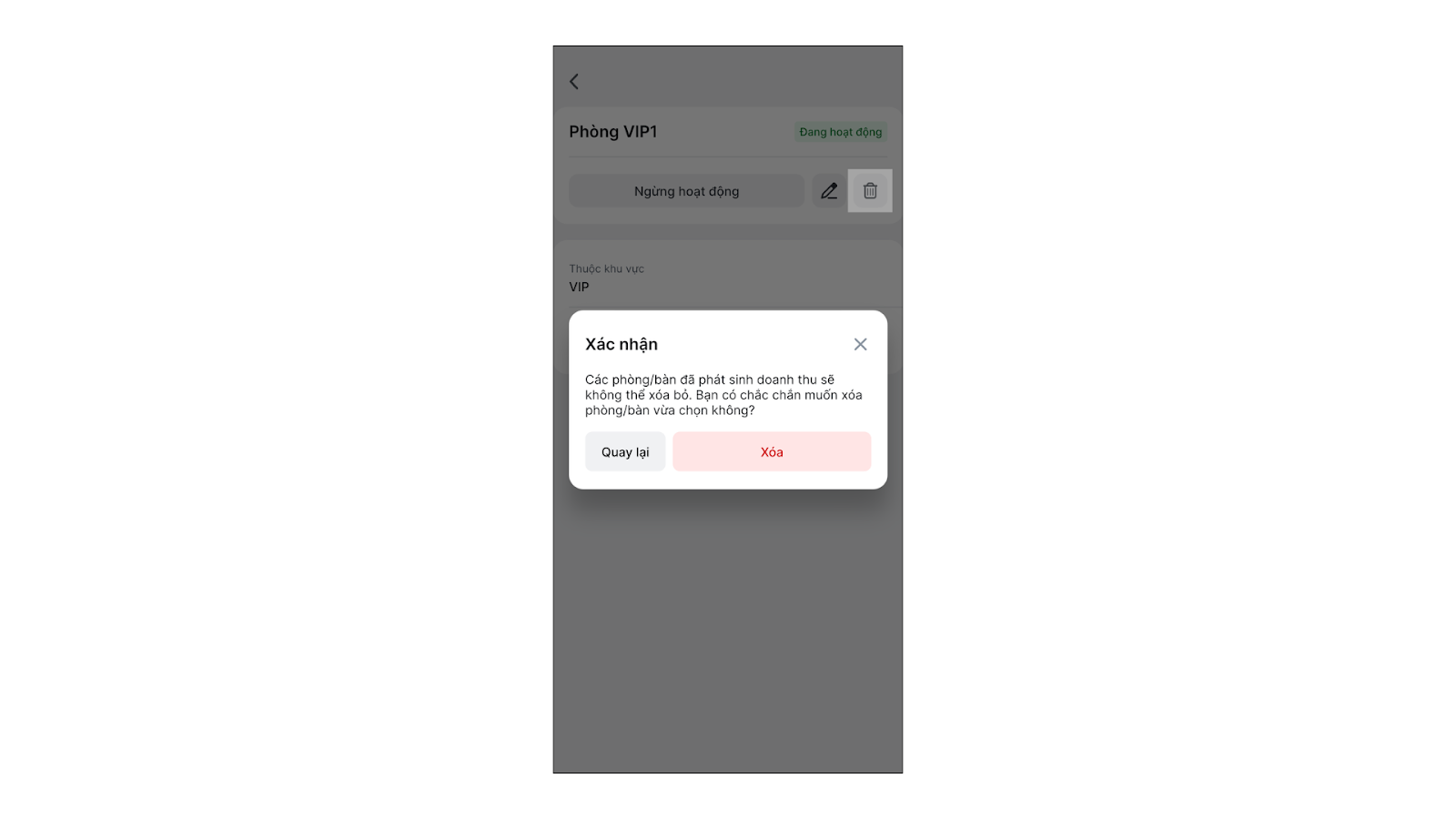 - Xóa phòng bàn không còn hoạt động: Trên màn hình chi tiết phòng bàn, bạn chọn biểu tượng thùng rác → chọn Xóa.