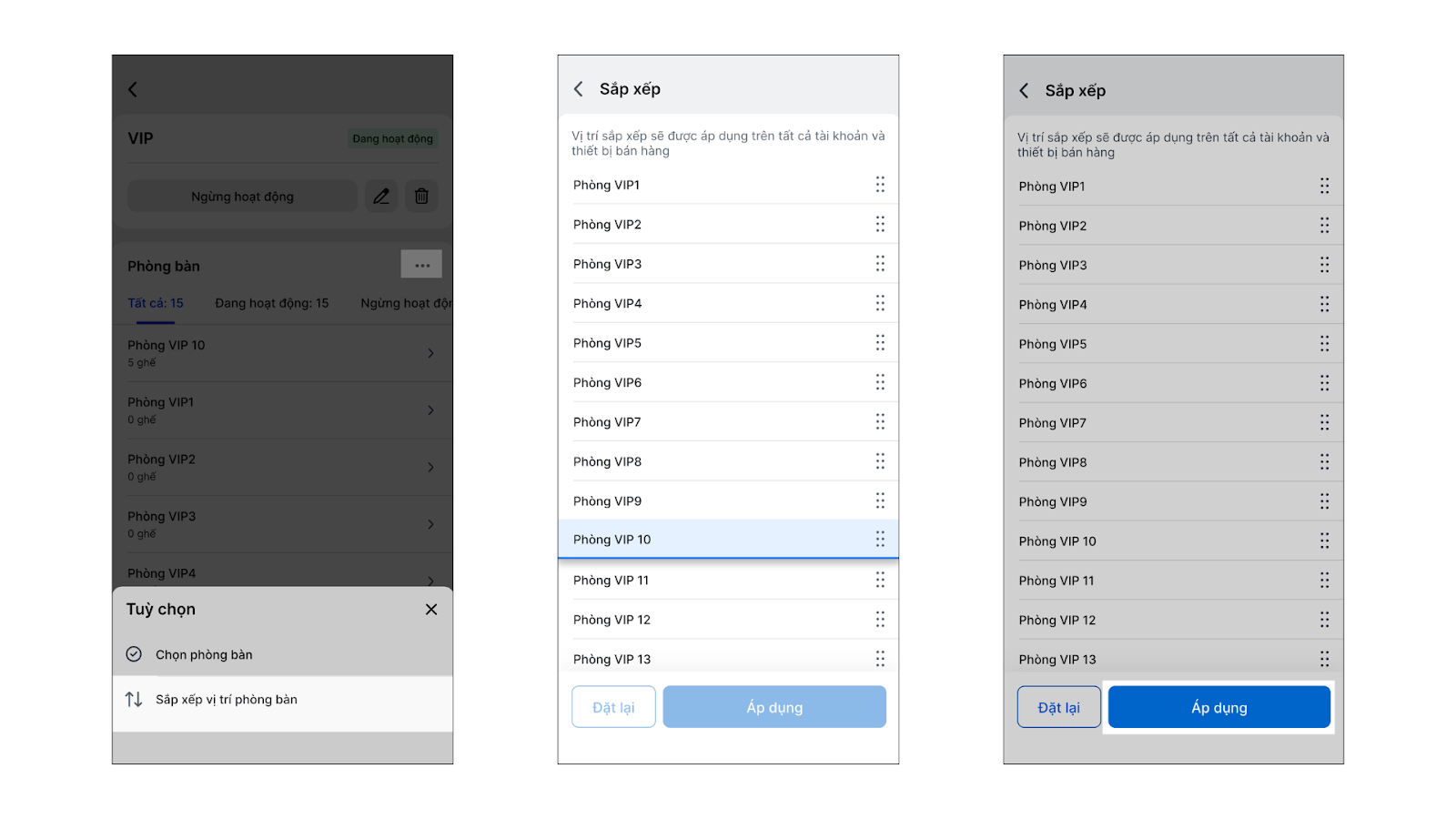 - Trên màn hình chi tiết khu vực, bạn chọn 3 chấm → Sắp xếp vị trí phòng bàn.