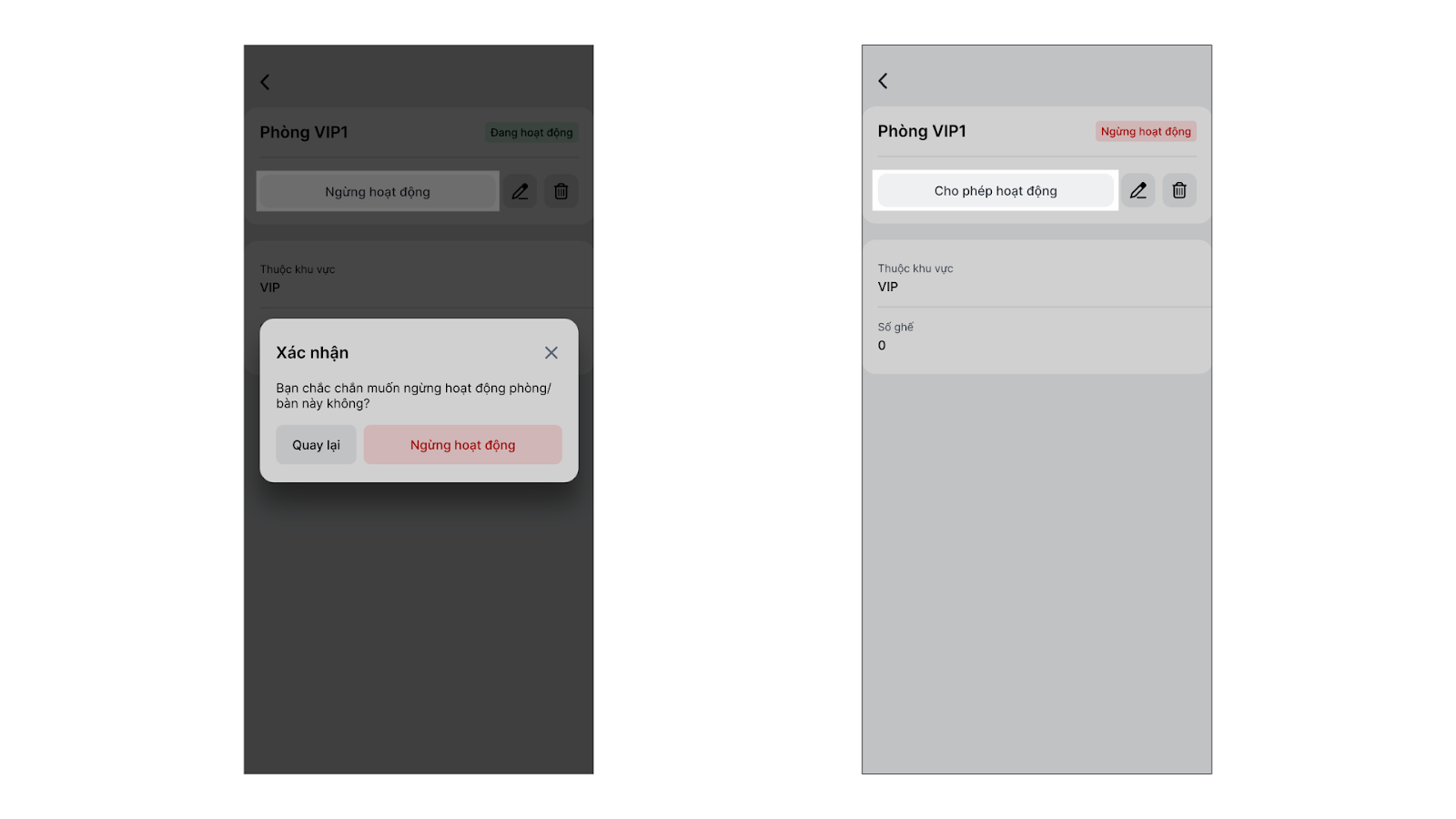 2. Xóa phòng/bàn