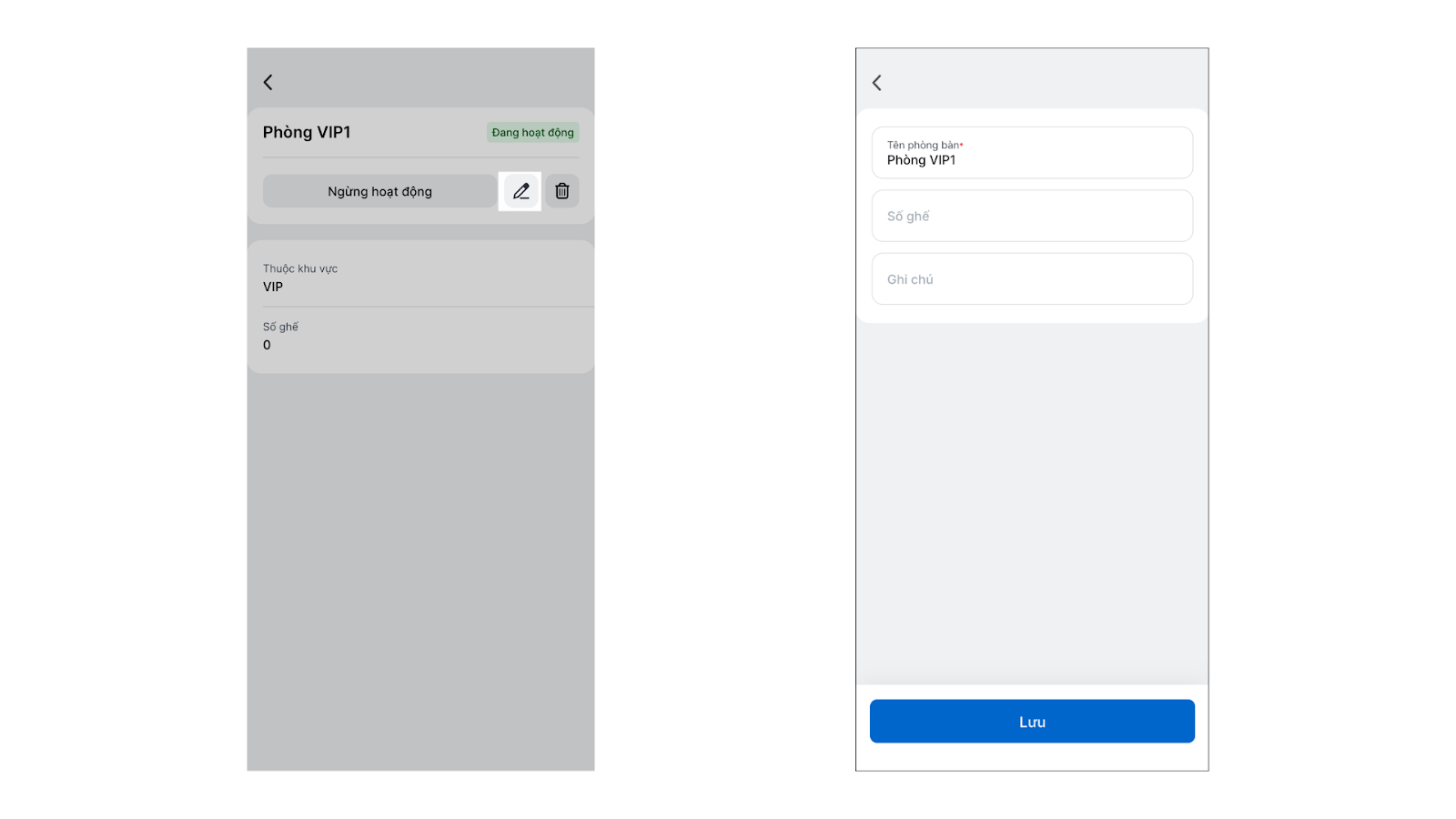 . - Sửa Tên phòng bàn, Ghi chú → nhấn Lưu.