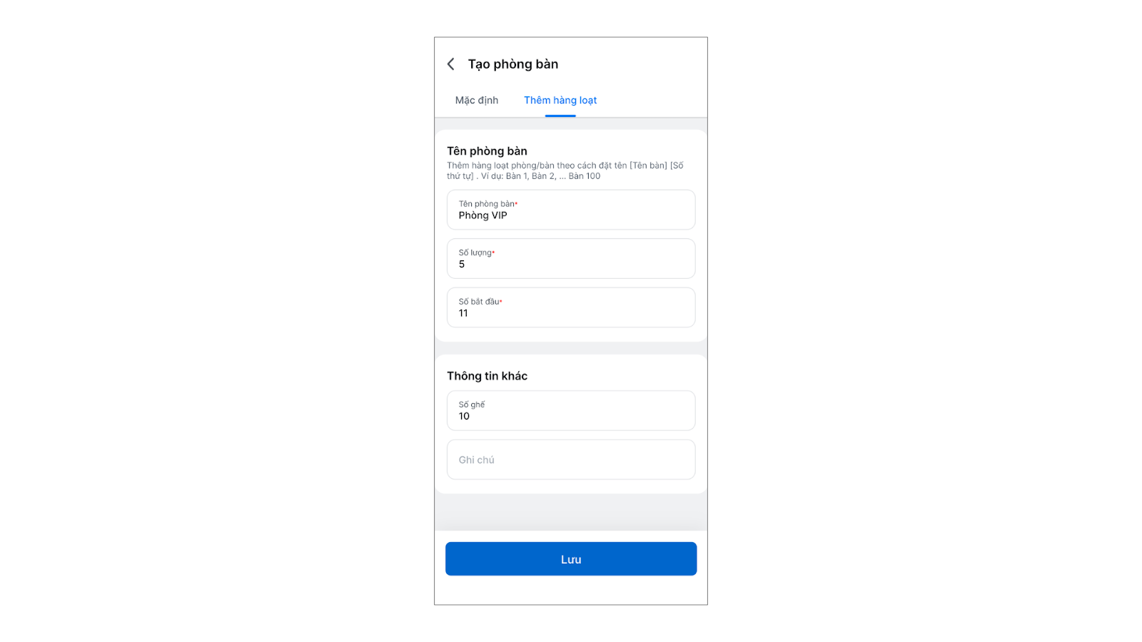 - Nhập các thông tin bắt buộc: Tên phòng bàn, Số lượng, Số bắt đầu.