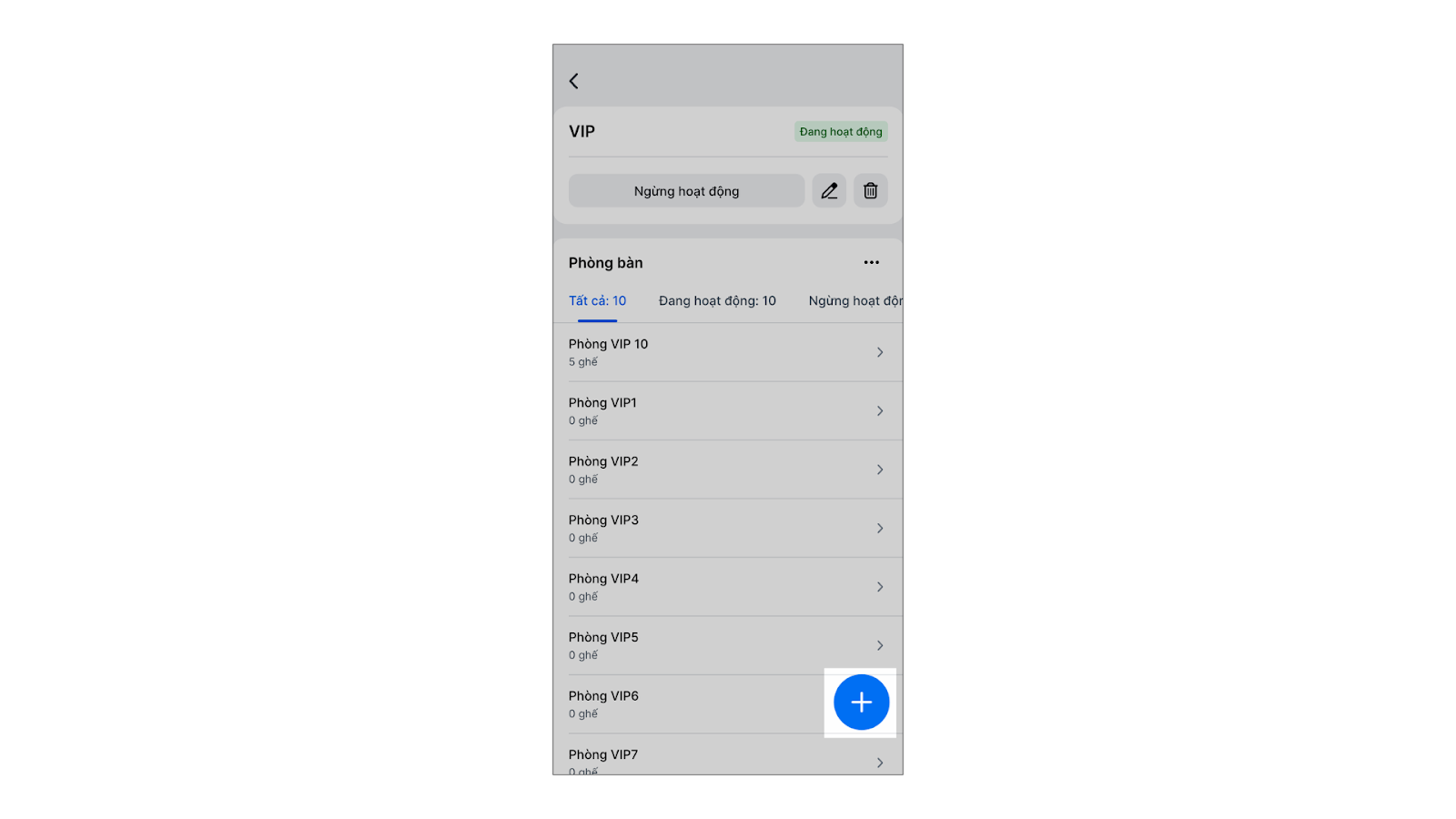 - Tình huống: Khi bạn muốn cập nhật chi tiết phòng/bàn phục vụ bên trong từng khu vực, ví dụ như thêm phòng/bàn mới để đón khách, chỉnh sửa thông tin, sắp xếp thứ tự hiển thị hoặc xóa bớt phòng/bàn.