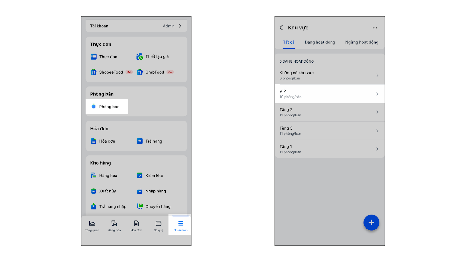 - Trên ứng dụng KiotViet Quản lý Nhà hàng, chọn mục Nhiều hơn → Phòng bàn → chọn 1 khu vực cụ thể.