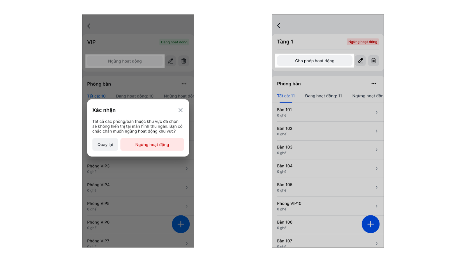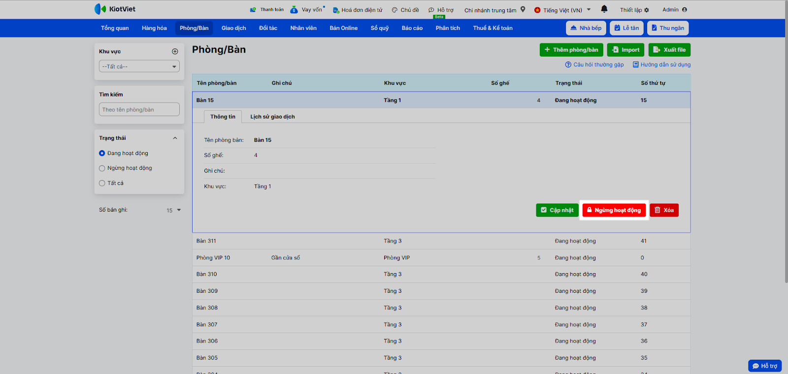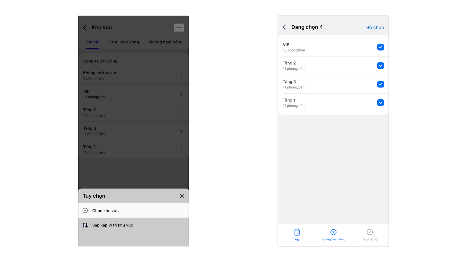 - Thao tác hàng loạt: Bạn có thể thực hiện việc xóa, Ngừng/ cho phép hoạt động cùng lúc nhiều phòng bàn trong 1 khu vực.