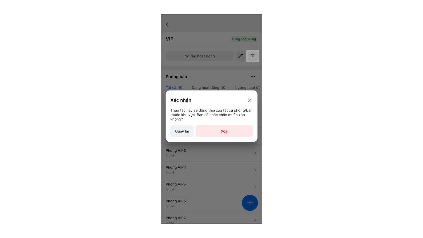 Lưu ý: Thao tác này sẽ đồng thời xóa tất cả phòng/bàn thuộc khu vực.