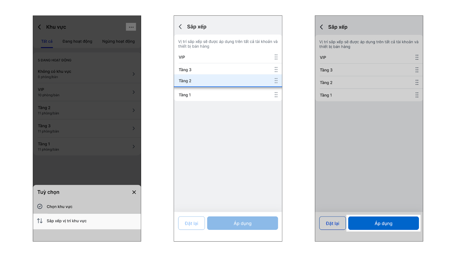 - Trên màn hình Khu vực, bạn chọn 3 chấm → Sắp xếp vị trí khu vực.