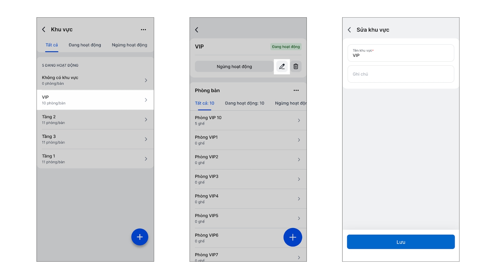 - Tình huống: Khi bạn cần thiết lập khu vực để quản lý phòng/bàn nhà hàng (ví dụ: Tầng 1, Tầng 2, Sân vườn) hoặc muốn thay đổi tên, vị trí hiển thị của các khu vực này ngay trên thiết bị di động.