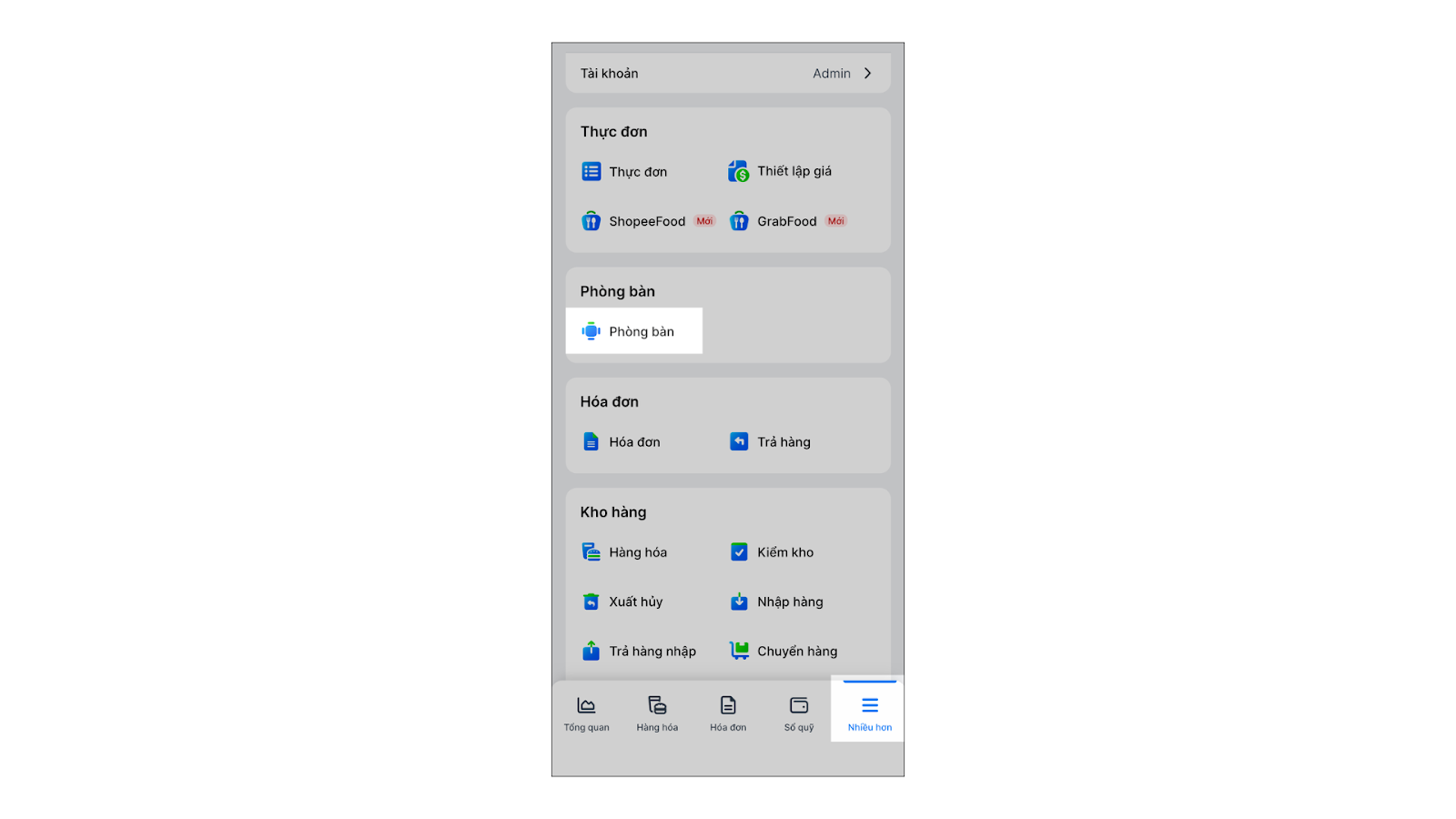 - Trên ứng dụng KiotViet Quản lý Nhà hàng, chọn mục Nhiều hơn → Phòng bàn.