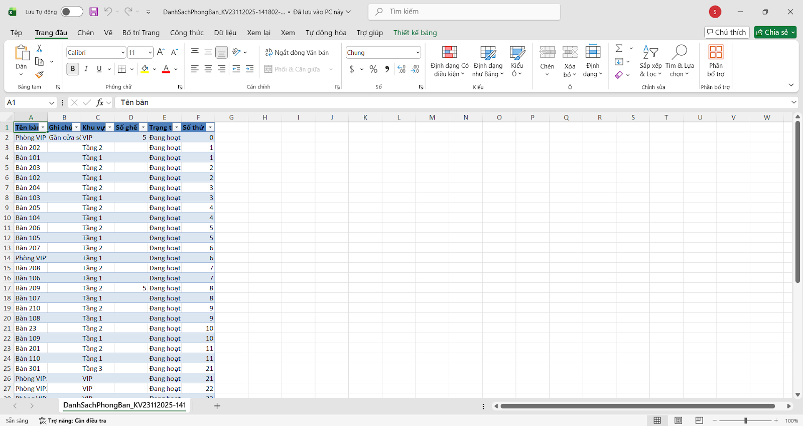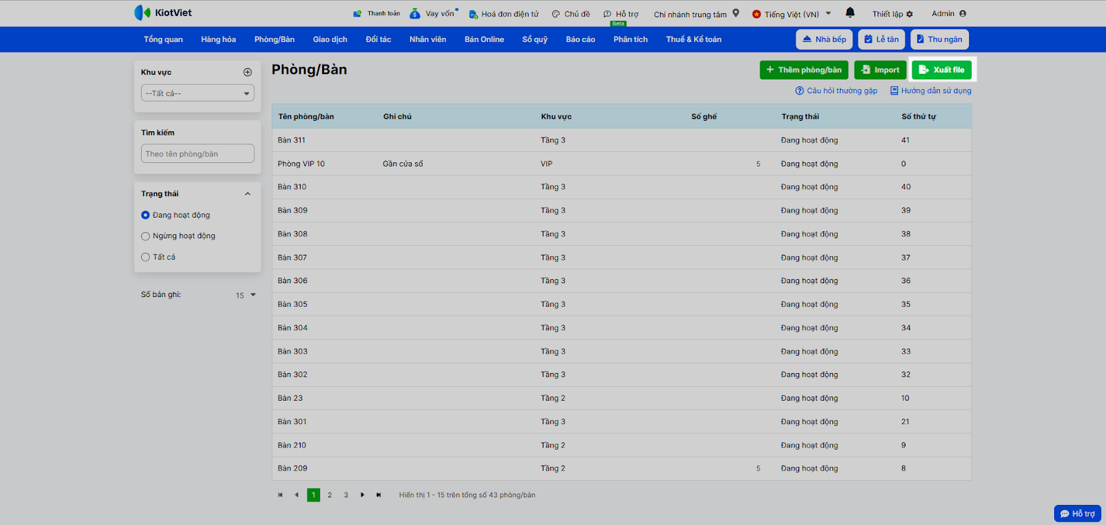- Tình huống: Bạn muốn xuất file Excel toàn bộ danh sách phòng/bàn hiện có để kiểm kê hoặc rà soát.
