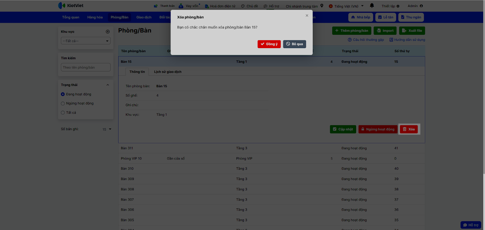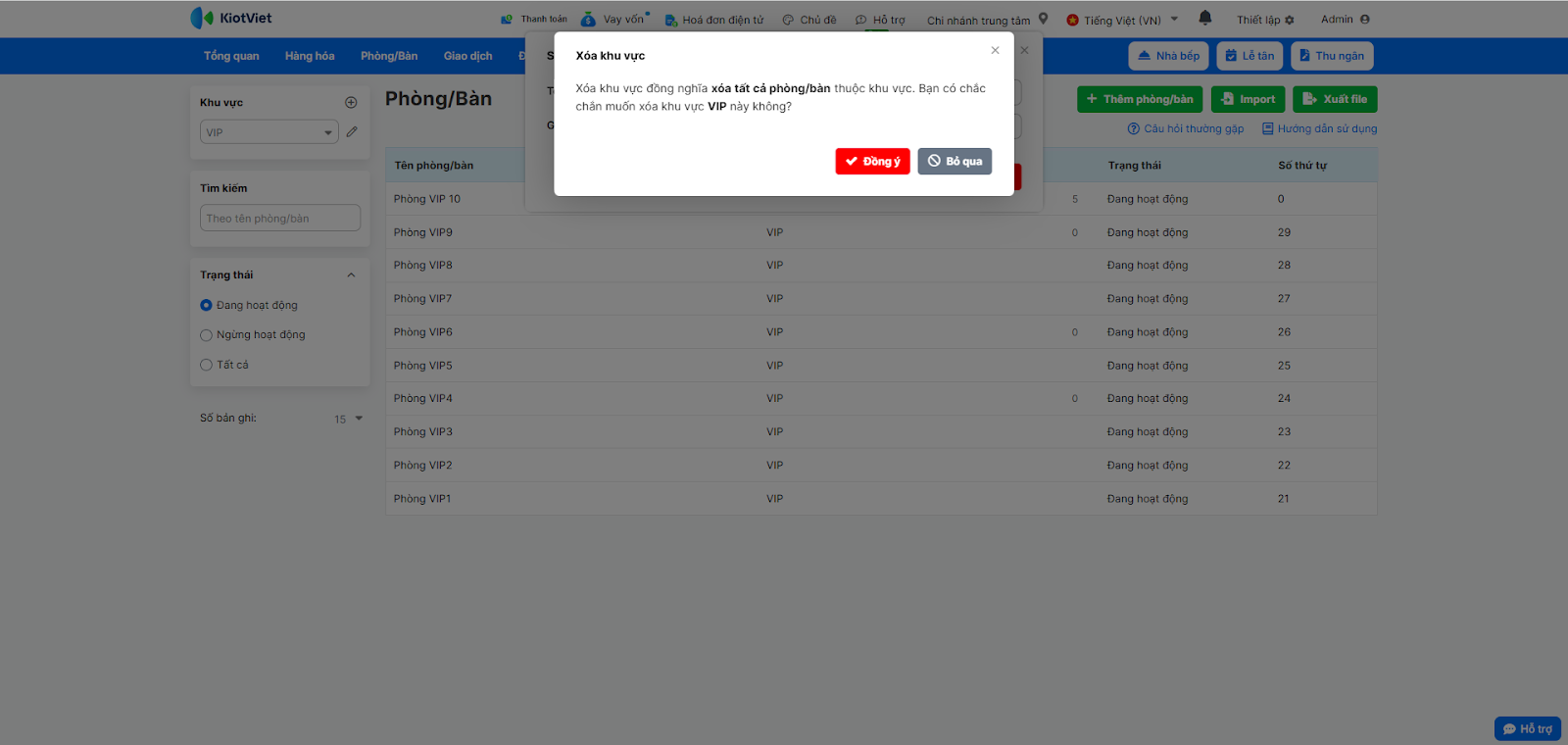 Lưu ý: Xóa khu vực đồng nghĩa xóa tất cả phòng/bàn thuộc khu vực. Nếu chắn chắn xóa, bạn chọn Đồng ý.