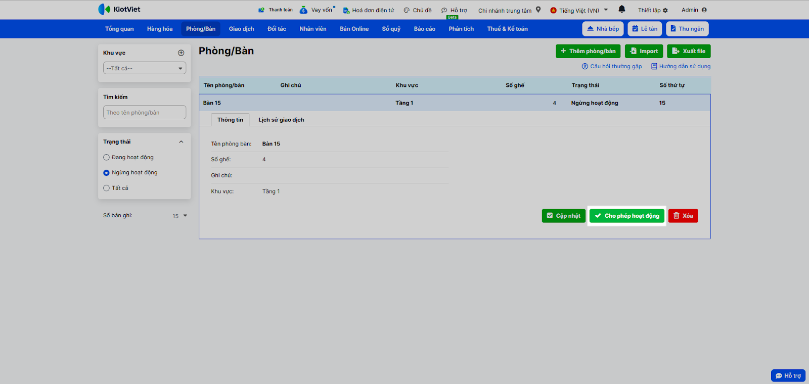 - Khi bàn được sửa xong và có thể sử dụng trở lại, bạn chọn lại bàn đó và nhấn Cho phép hoạt động.