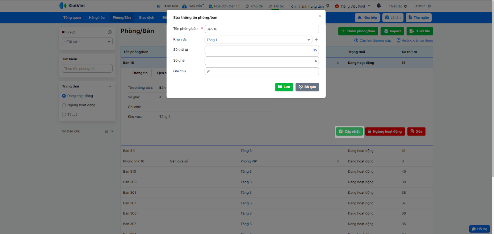 - Cập nhật lại thông tin (ví dụ: đổi Tên phòng bàn thành “Bàn 16”, thay đổi Số ghế).