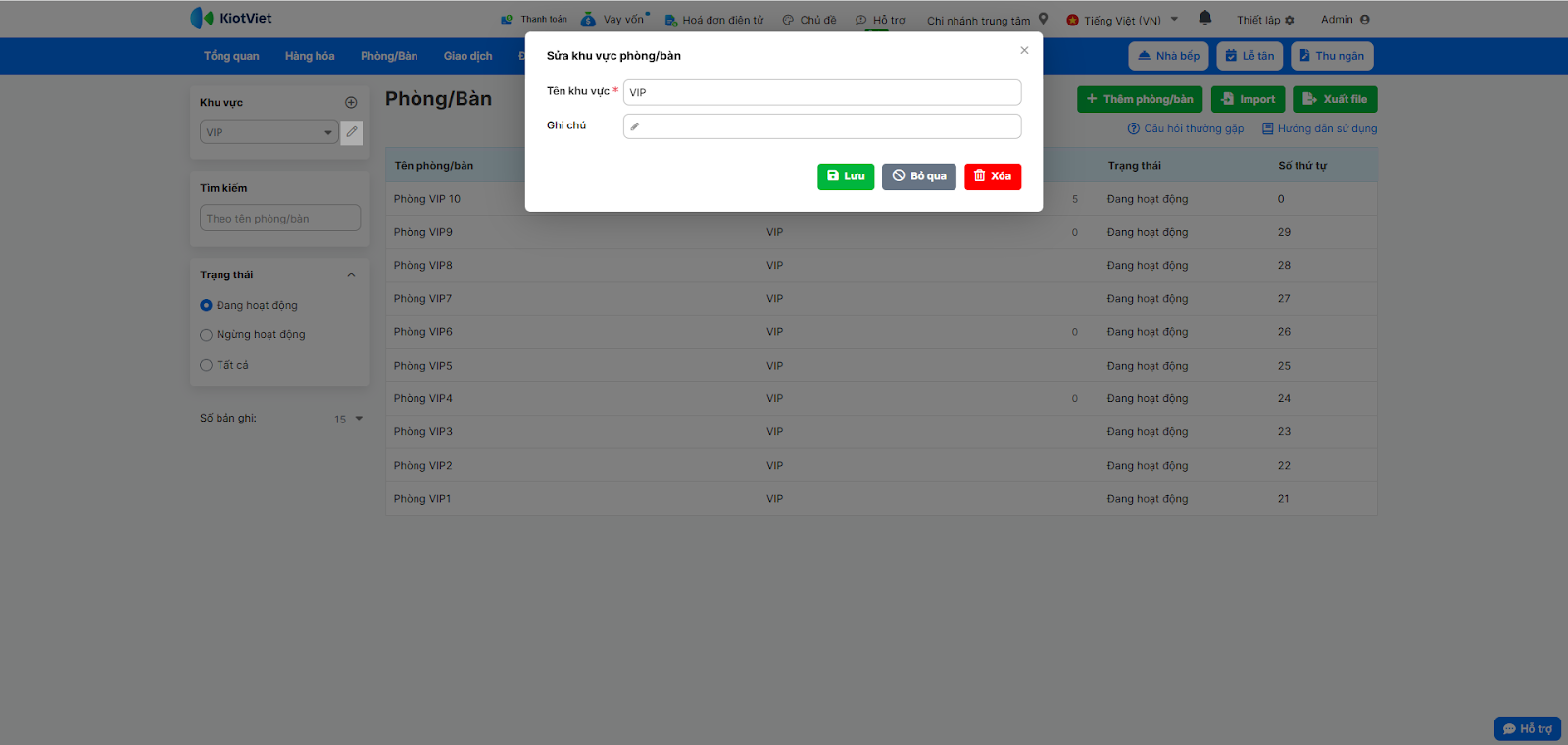 Lưu ý: Các phòng. bàn đã phát sinh doanh thu sẽ không thể xóa.