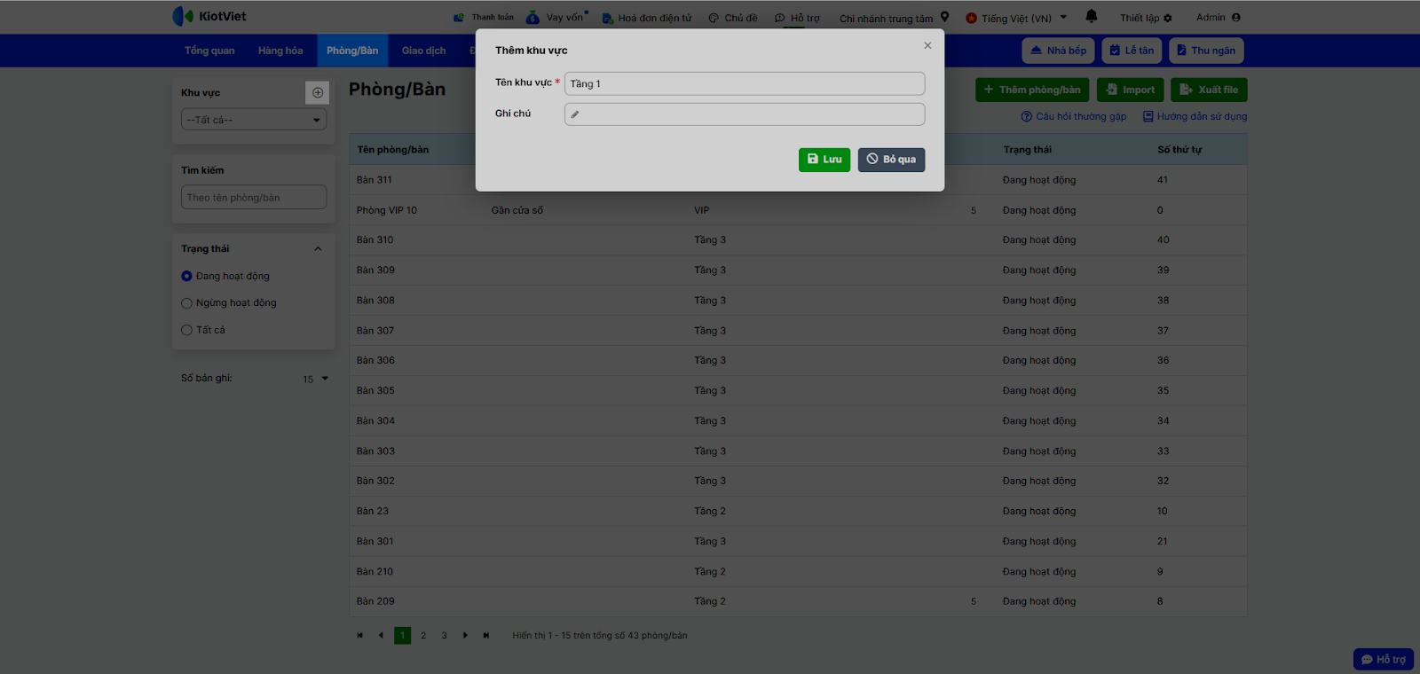 2. Quản lý Phòng/bàn