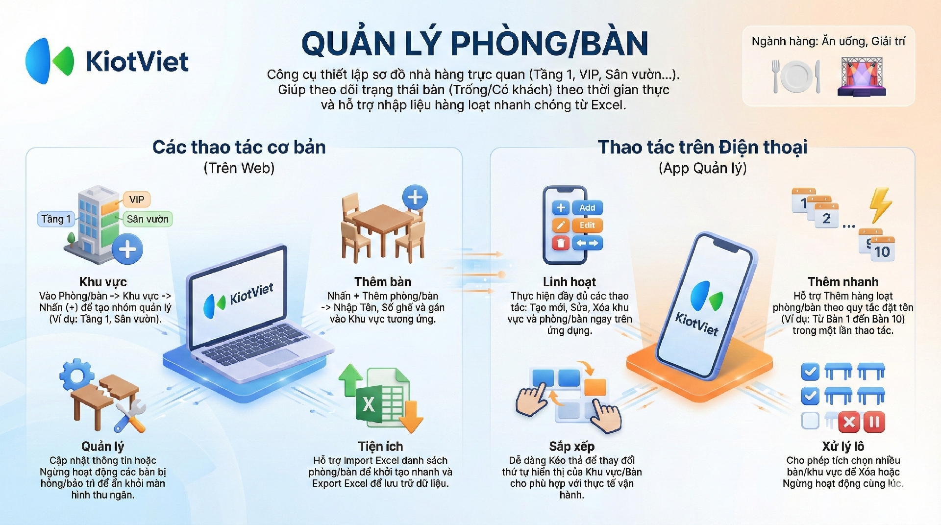 - Nhập liệu hàng loạt: Tiết kiệm thời gian bằng cách nhập (Import) hàng loạt phòng/bàn từ file Excel.