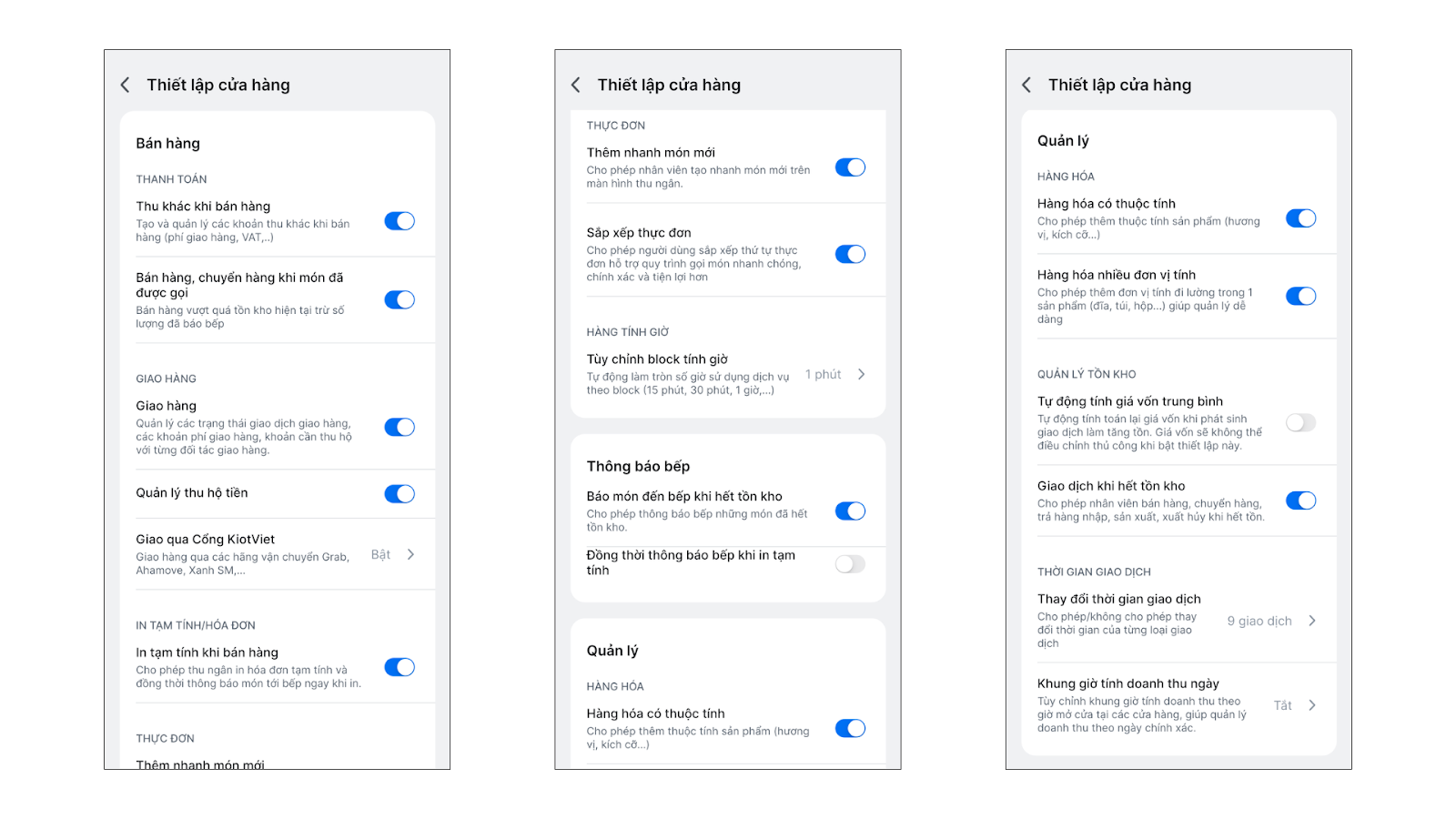 - Bán hàng: Các thiết lập bán hàng được thực hiện trên ứng dụng bao gồm: