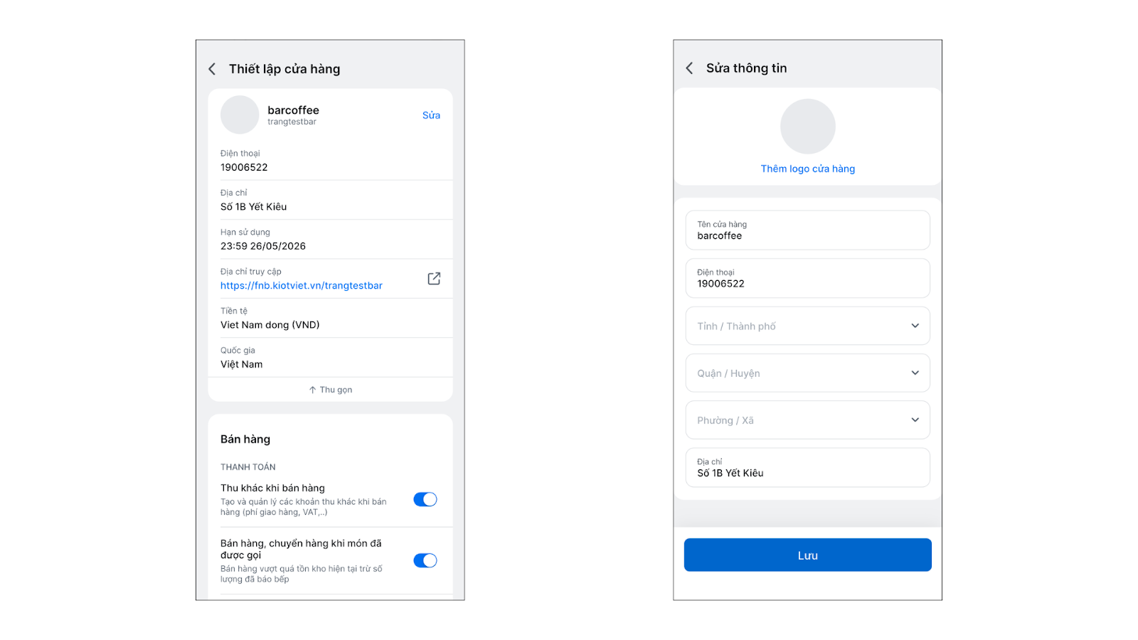 - Cập nhật Tên cửa hàng, Địa chỉ, Khu vực, Phường/Xã.
