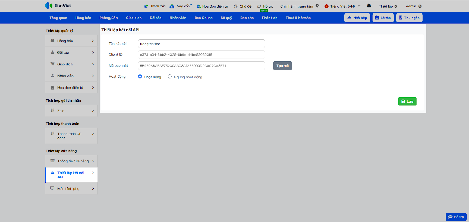 - Tình huống: Bạn muốn kết nối KiotViet với các phần mềm của bên thứ ba (ví dụ: website đặt bàn, ứng dụng CRM riêng).