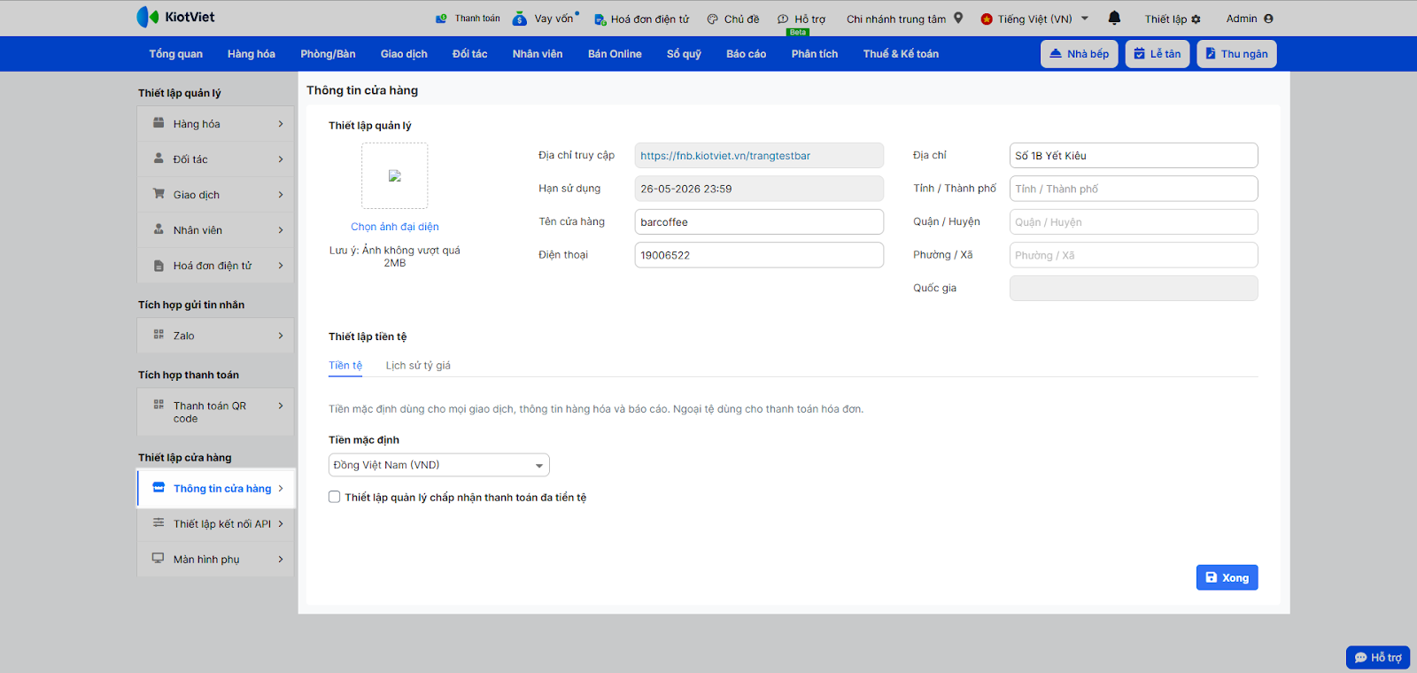 - Cá nhân hóa cửa hàng: Cập nhật thông tin cửa hàng (logo, địa chỉ) để hiển thị trên hóa đơn và màn hình phụ.