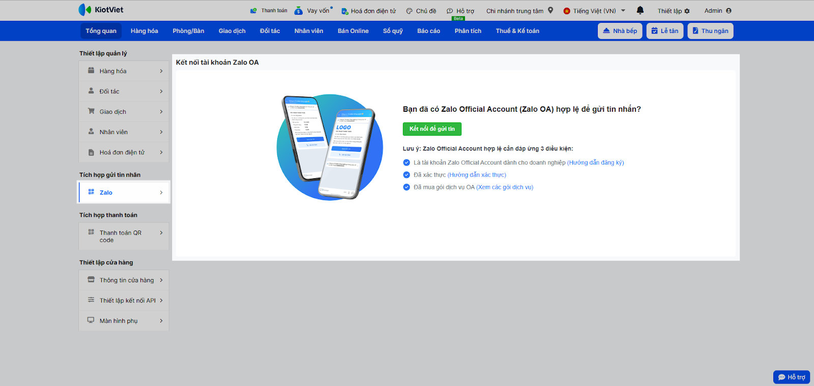 - Thao tác thực hiện như sau: Tại màn hình Thiết lập cửa hàng, chọn Zalo và thực hiện các bước kết nối.