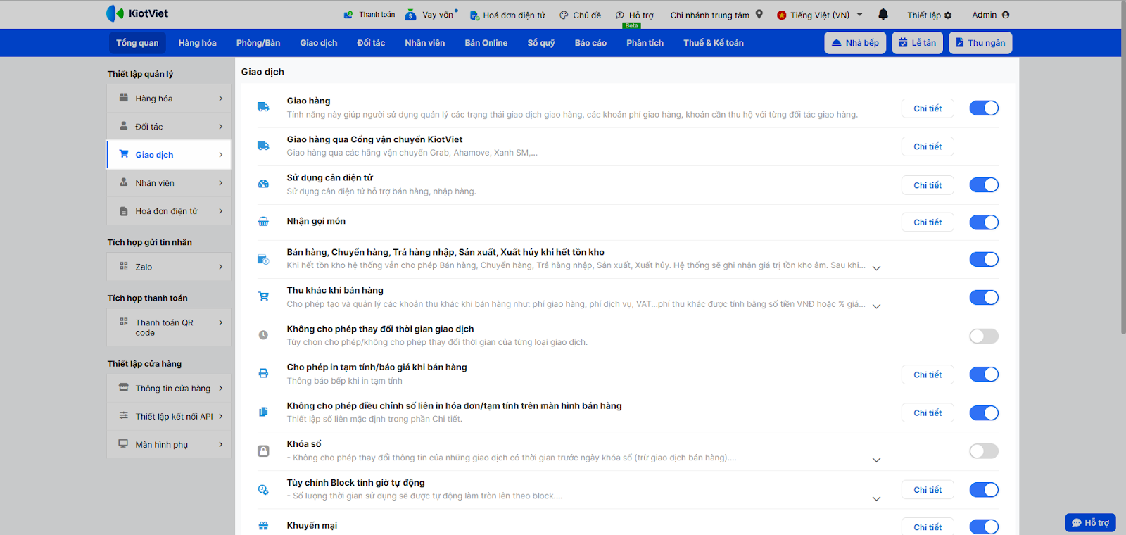 - Tại màn hình Thiết lập cửa hàng → Thiết lập quản lý, chọn Giao dịch.