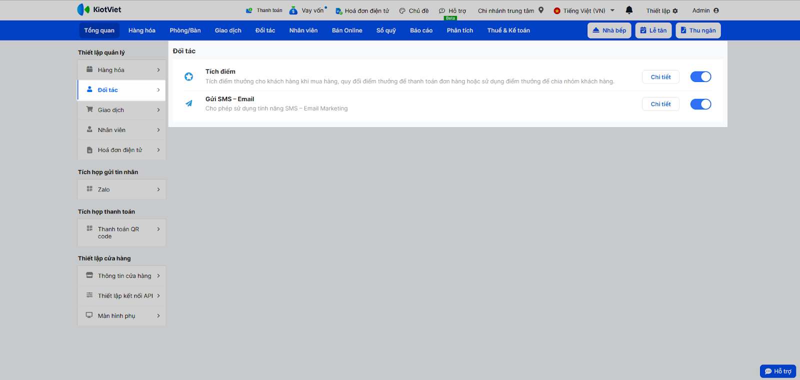 - Tại màn hình Thiết lập cửa hàng → Thiết lập quản lý, chọn Đối tác.