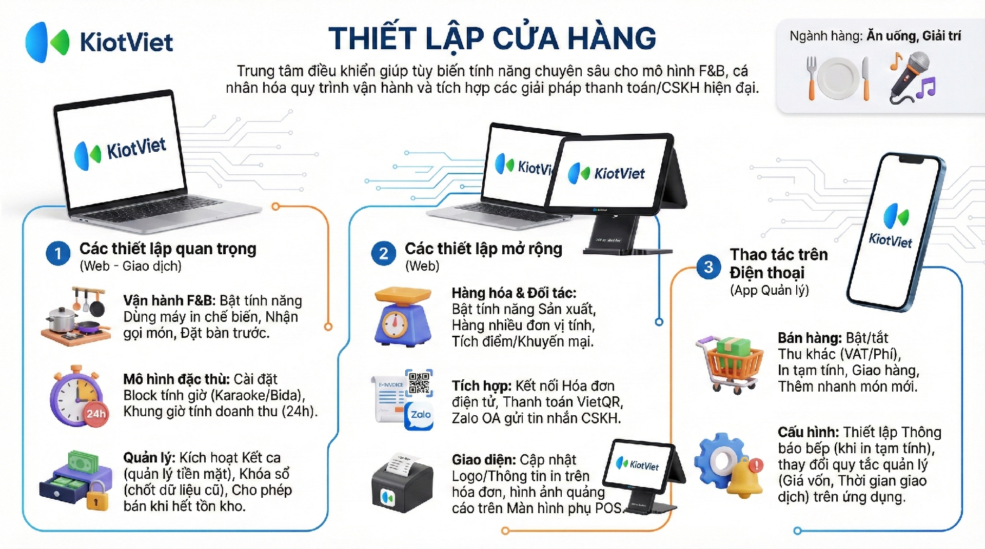 Màn hình “Thiết lập cửa hàng” là trung tâm điều khiển của KiotViet, nơi bạn có thể tùy chỉnh và kích hoạt các tính năng để phù hợp nhất với mô hình kinh doanh nhà hàng, quán ăn, hoặc quán karaoke của mình. Hệ thống hỗ trợ bật sẵn những chức năng cơ bản, và bạn có thể tùy chỉnh chuyên sâu các nghiệp vụ tại đây.
