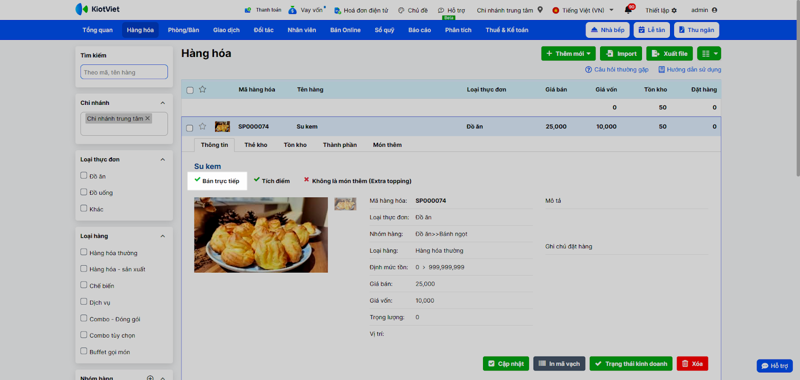 - Để ẩn/hiển món trong menu, hãy chọn/bỏ chọn “Bán trực tiếp” cho từng hàng hoá trong Hàng hóa → Danh mục.