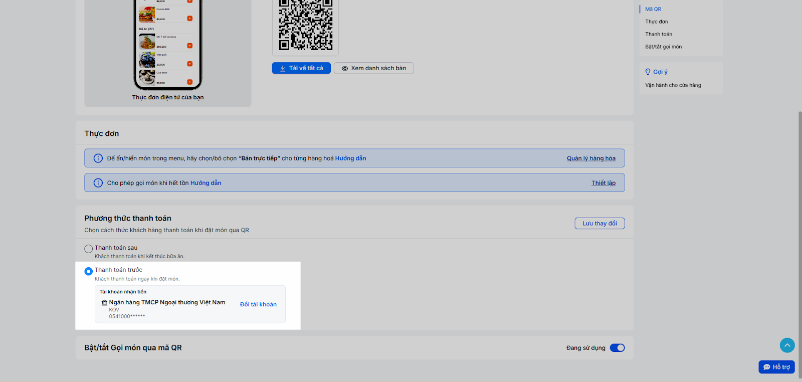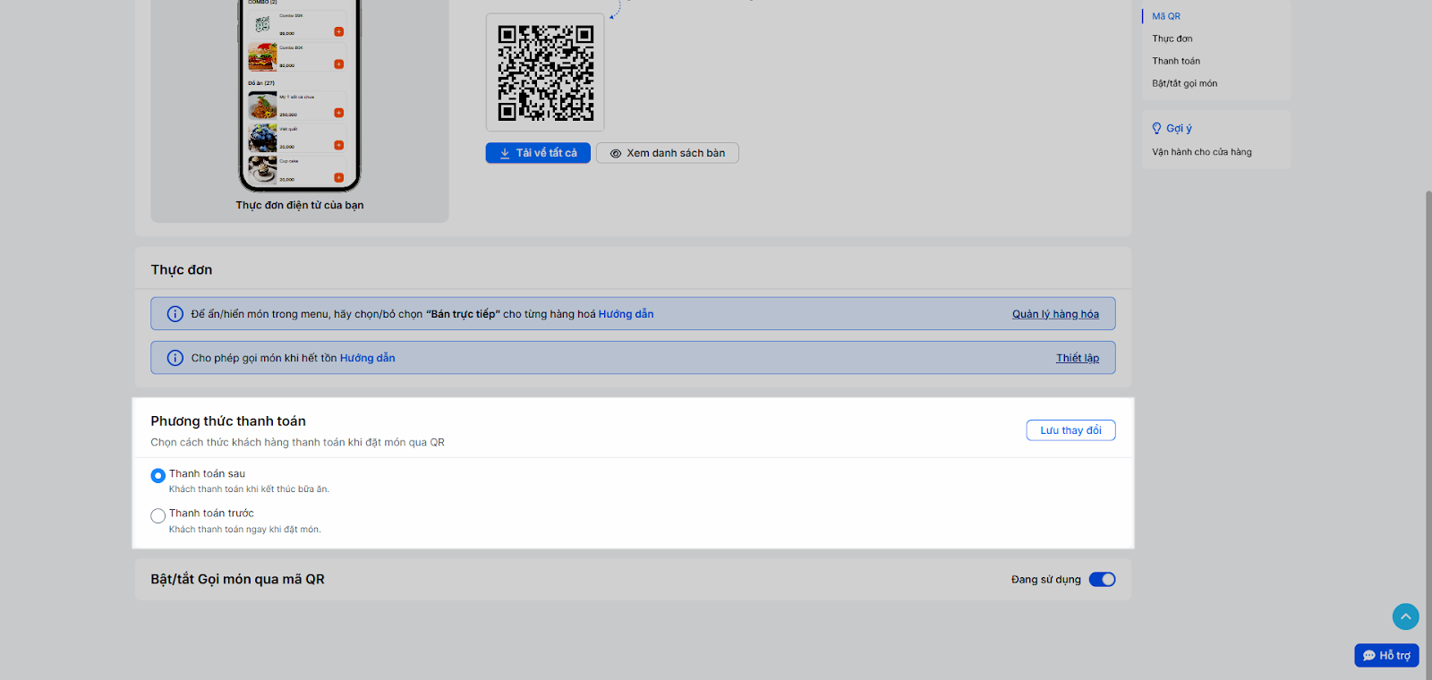 - Phương thức thanh toán: Bạn chọn cách thức khách hàng thanh toán khi đặt món qua QR