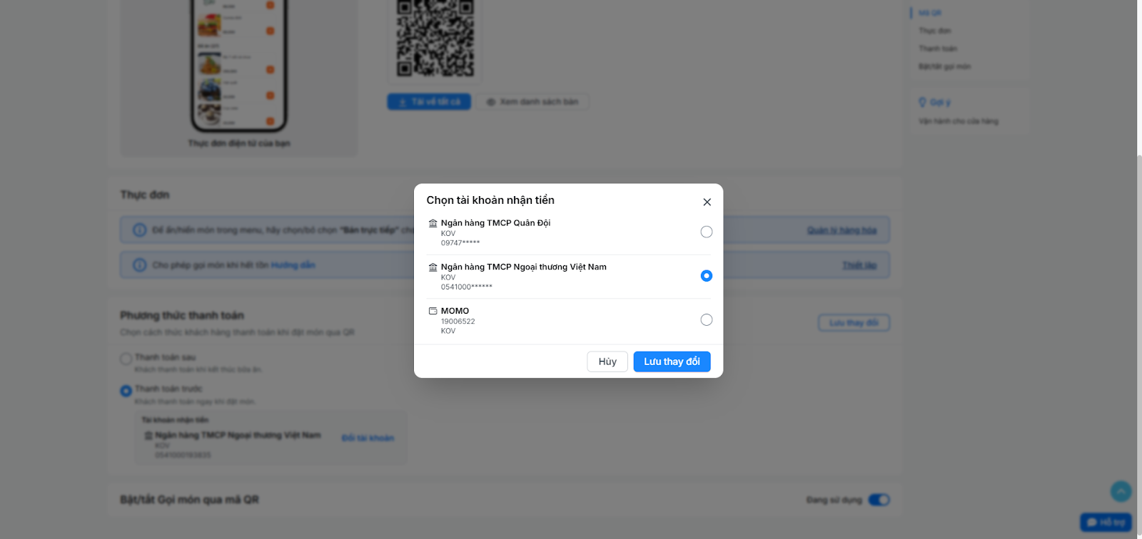 - Thanh toán trước: Khách thanh toán ngay khi đặt món. Bạn chọn 1 tài khoản ngân hàng/Ví điện tử đã đăng ký dịch vụ nhận thông báo thanh toán QR với KiotViet và đang hoạt động trong Sổ quỹ.