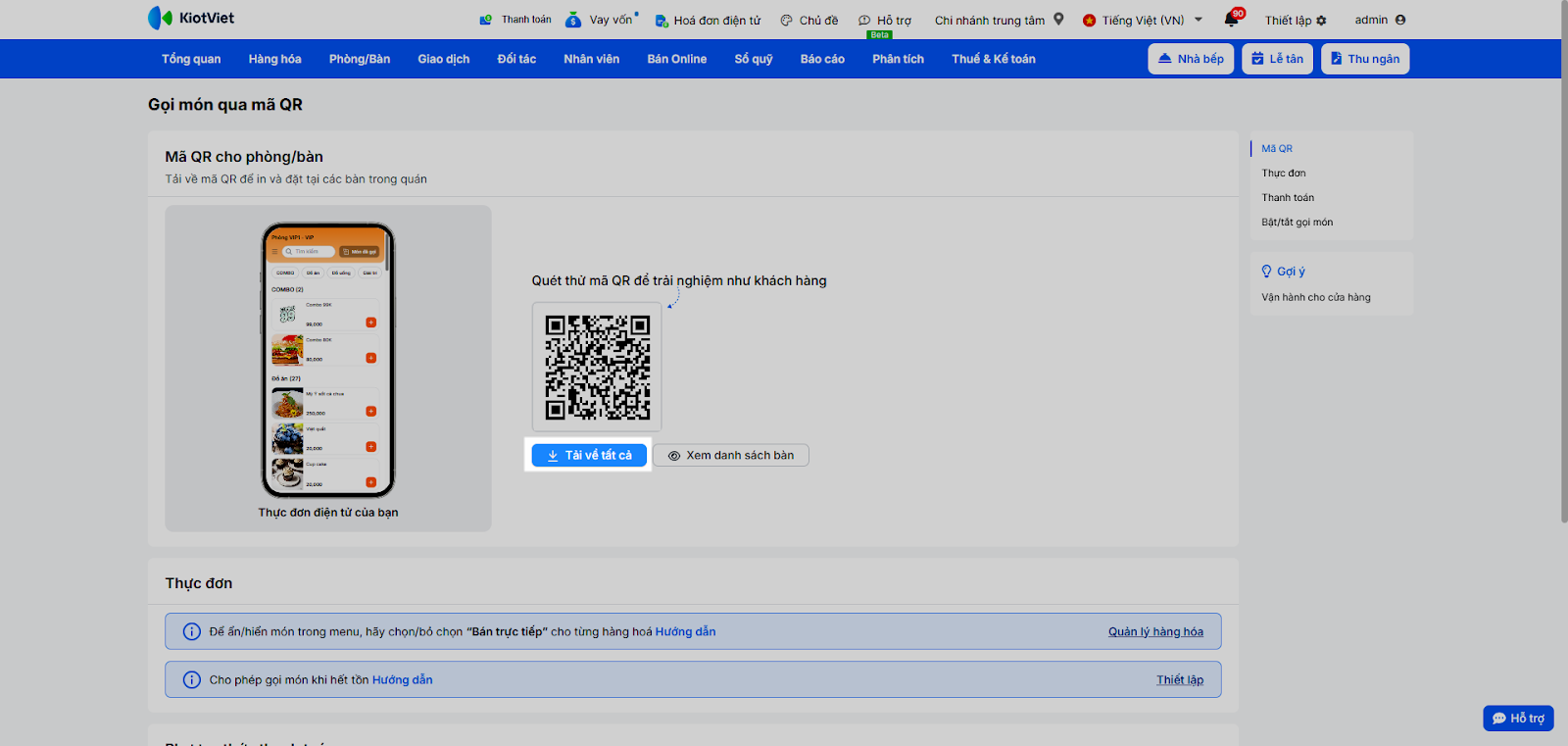 - Cách 1: Tại màn hình Gọi món qua mã QR, chọn Tải tất cả mã QR.