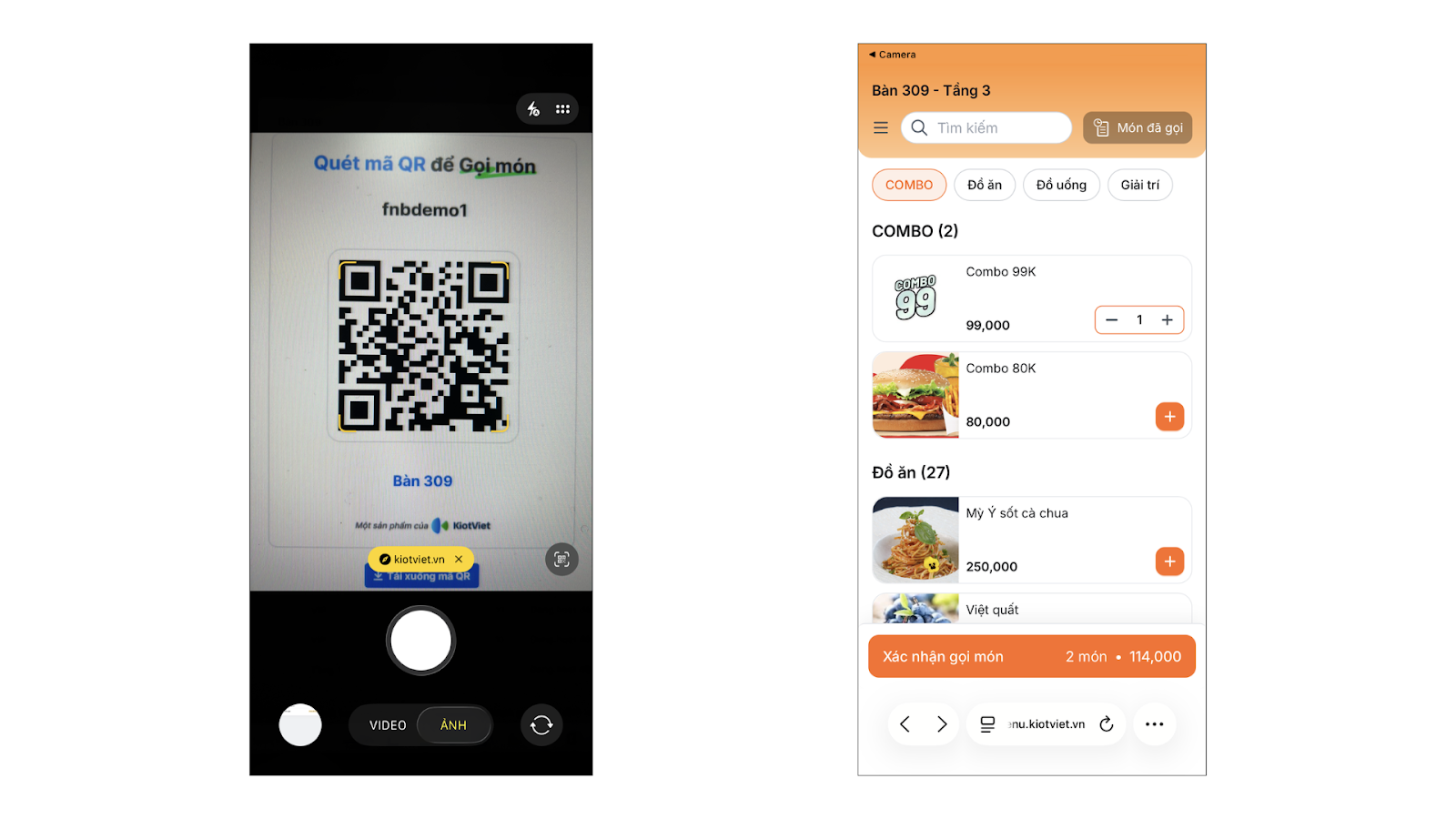 - Tình huống: Khách hàng đến bàn, sử dụng điện thoại để quét mã và tự thực hiện thao tác gọi món.