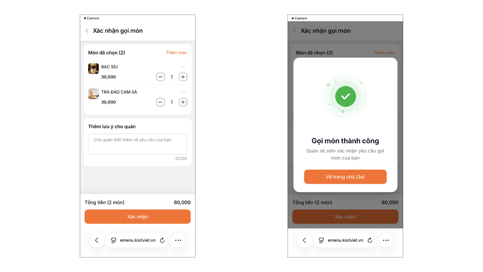 - Nếu quán áp dụng Thanh toán sau: Khách hàng nhấn Xác nhận → đơn hàng được gửi ngay vào hệ thống.