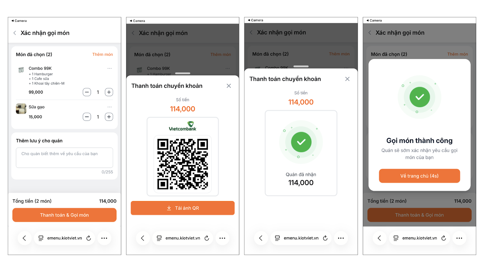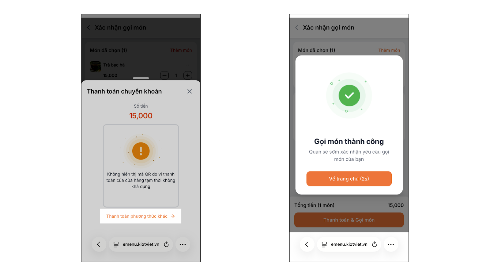 - Nếu quán áp dụng Thanh toán trước: Khách cần hoàn tất thanh toán online thì đơn hàng mới được gửi đi. Khách nhấn Thanh toán & Gọi món → quét mã QR chuyển khoản → hệ thống nhận thành công sẽ hiển thị thông báo.