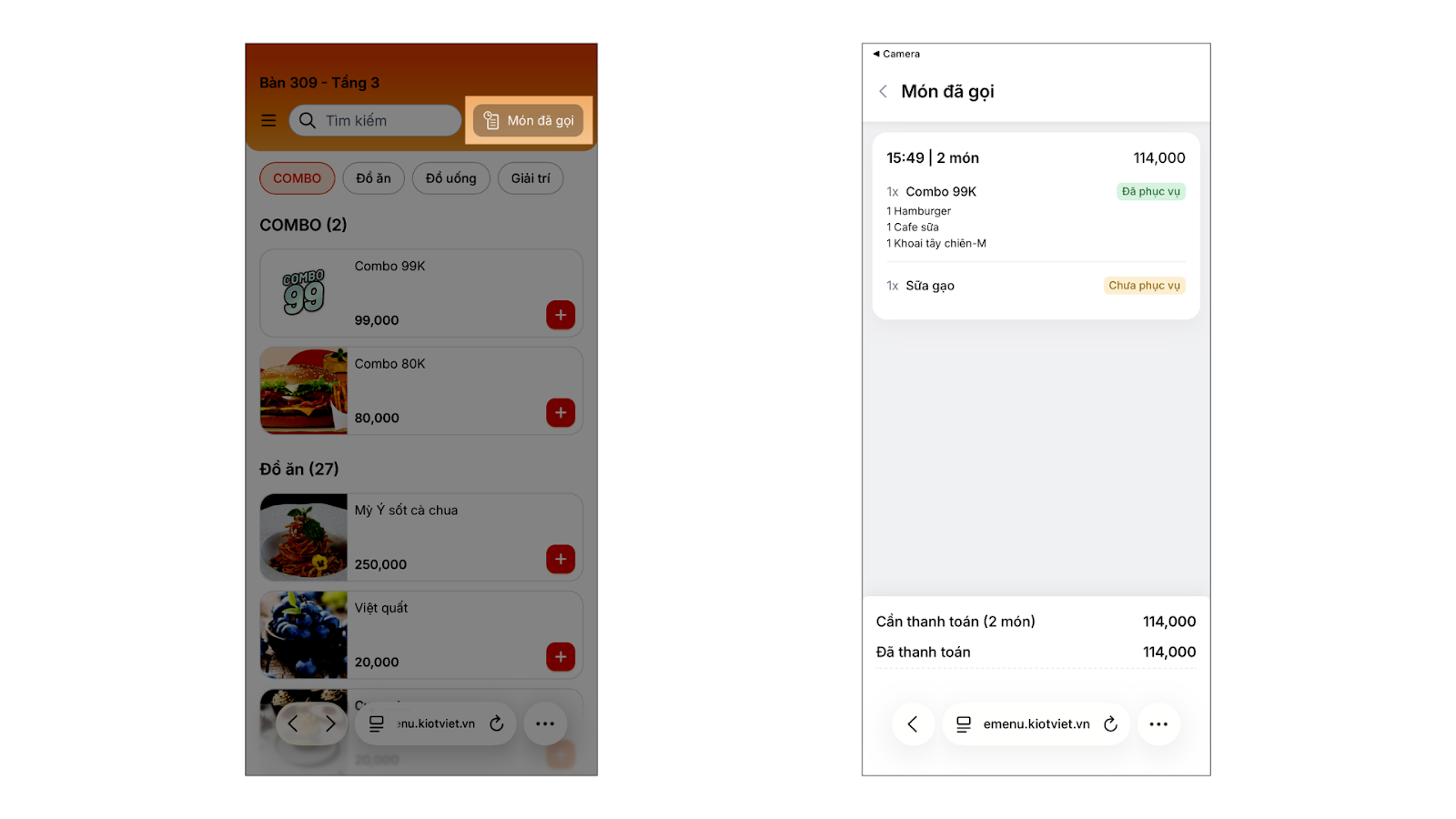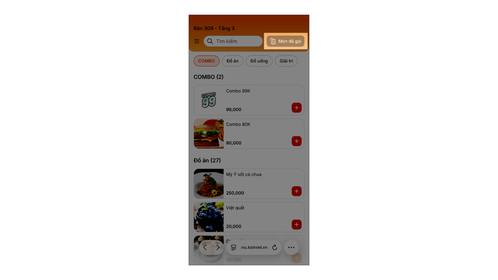 (2) Hiển thị phía khách hàng: Món mới thêm sẽ tự động cập nhật vào danh sách Món đã gọi trên điện thoại khách.