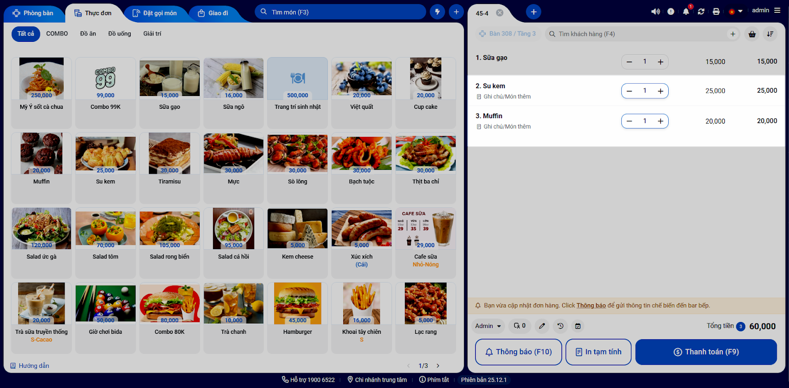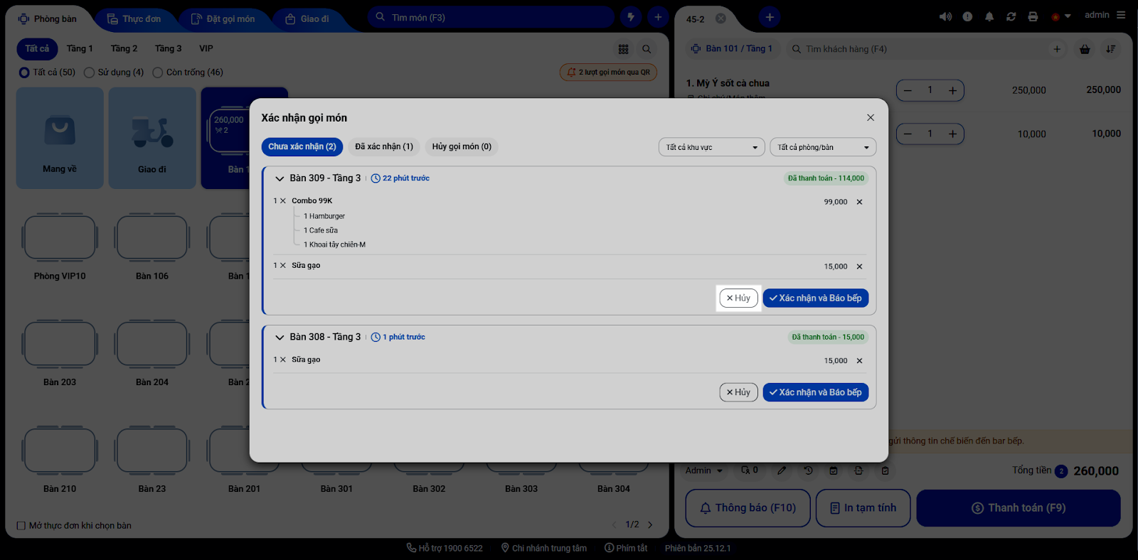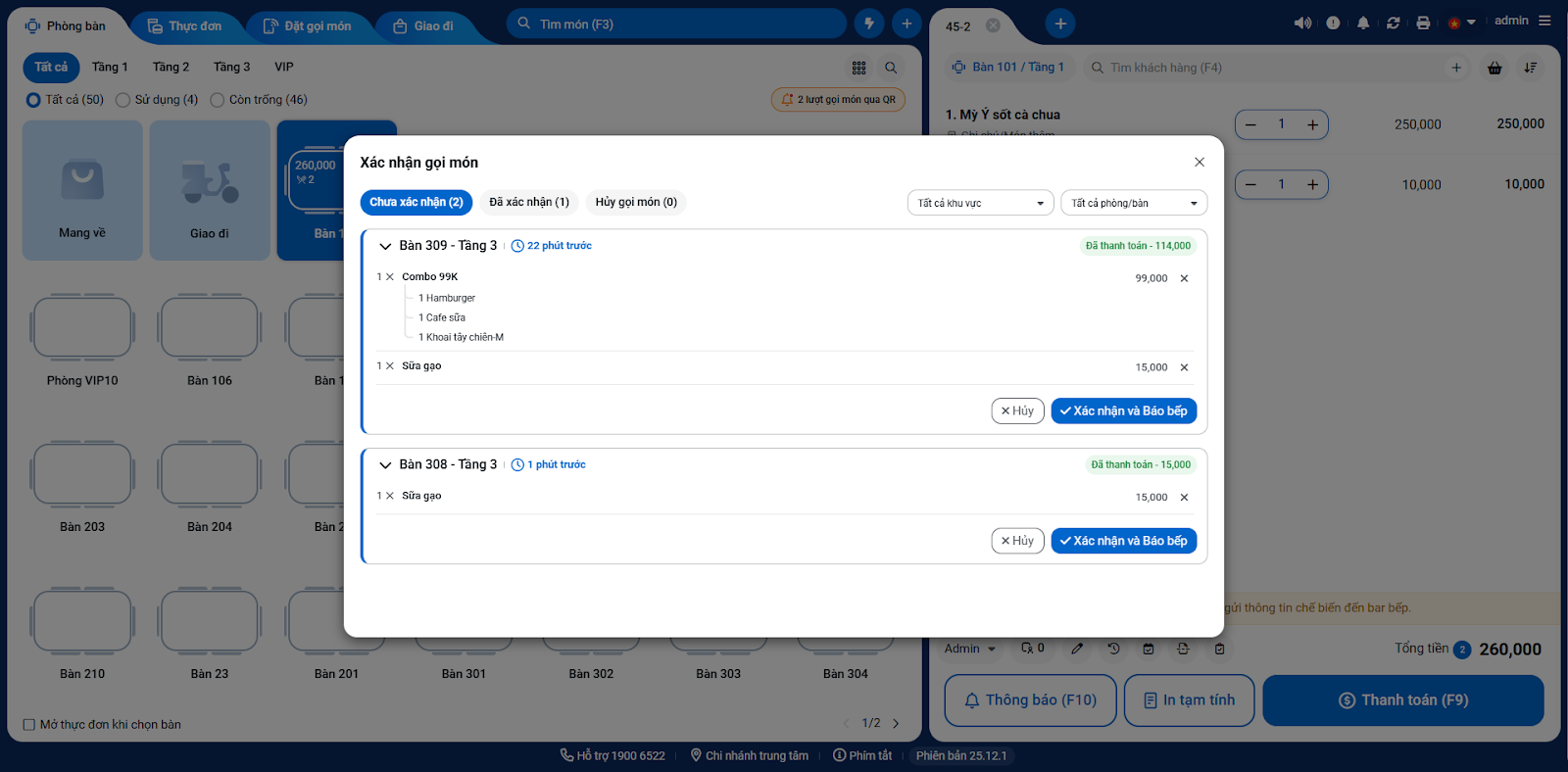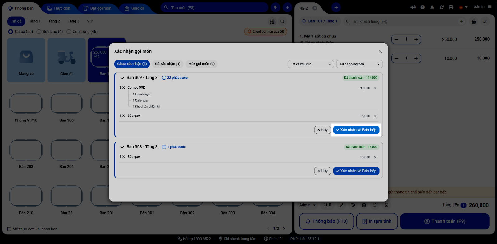 (1) Sau khi nhấn Xác nhận và Báo bếp, các món ăn sẽ được cập nhật vào hóa đơn chi tiết của bàn tương ứng.