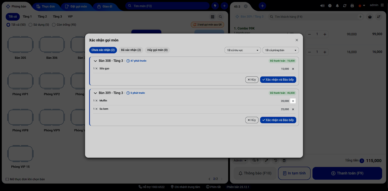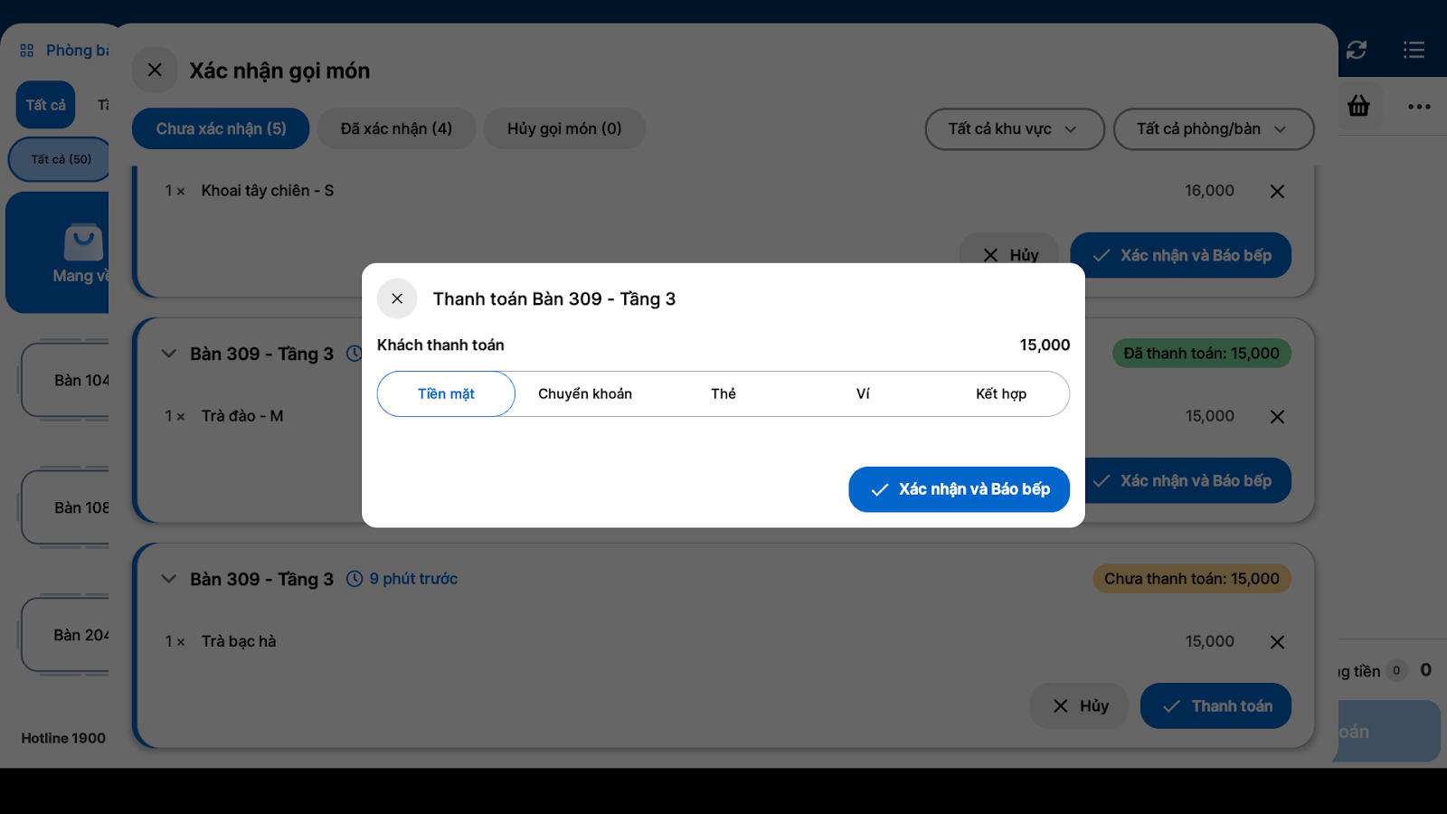 - Duyệt đơn: Nhấn nút Xác nhận và Báo bếp. Các món sẽ tự động vào hóa đơn của bàn và in phiếu xuống bếp/bar.