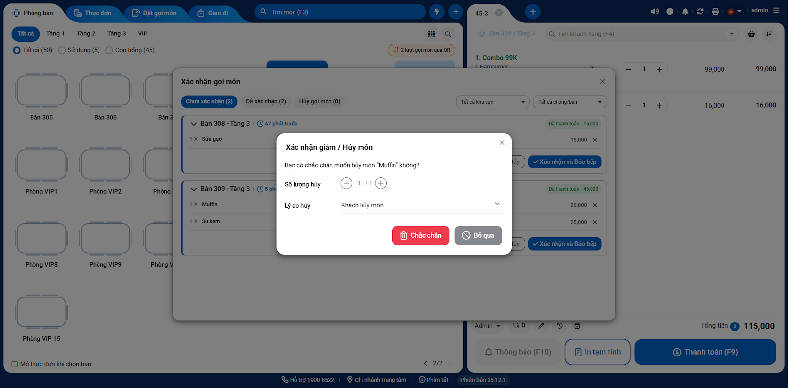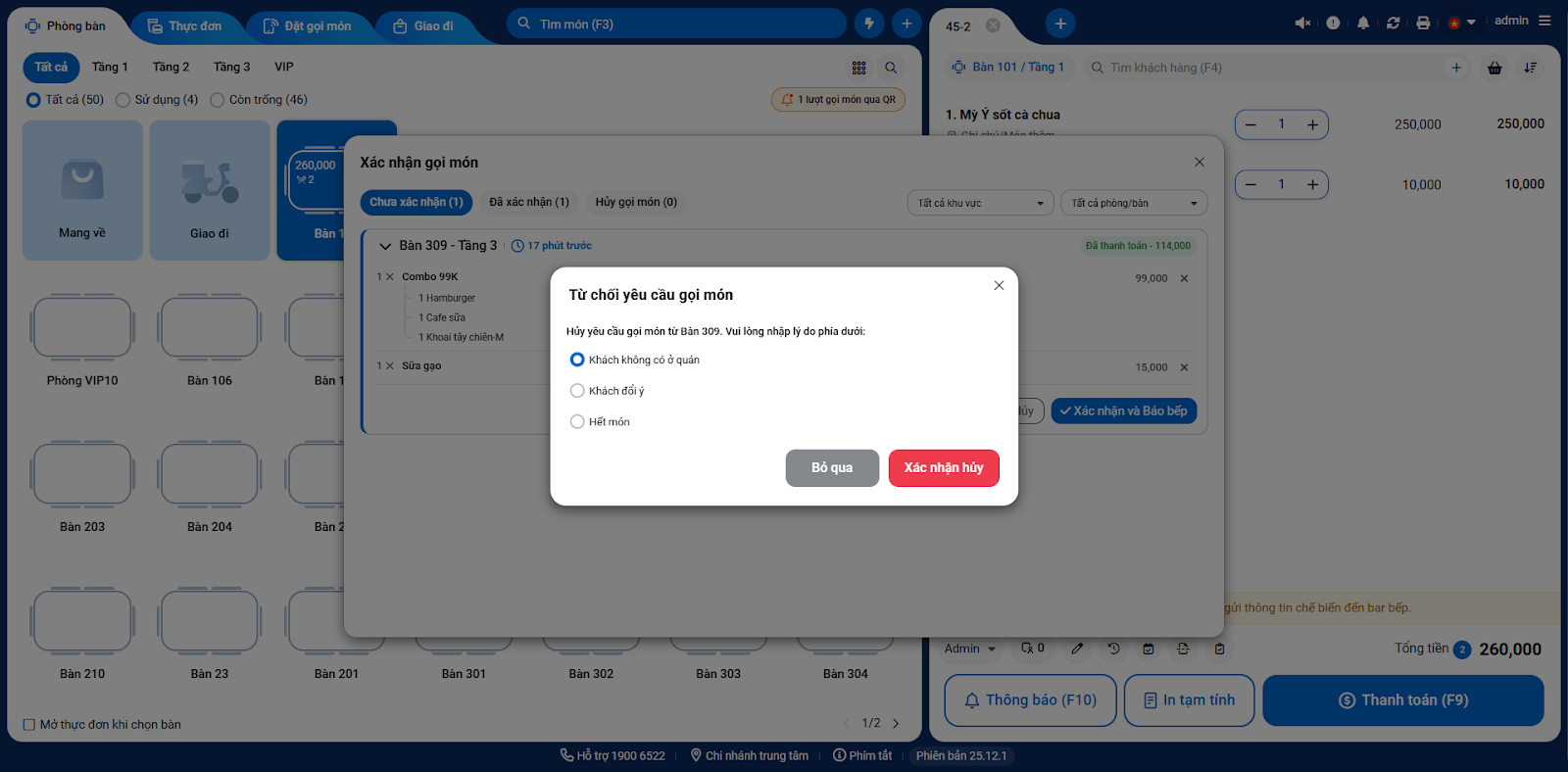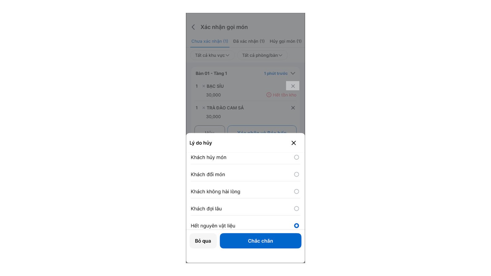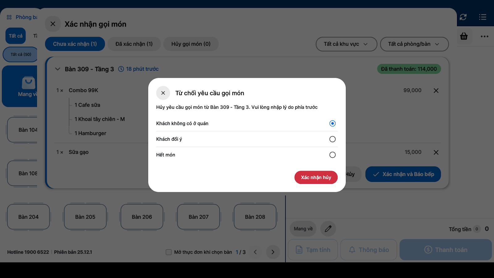- Hủy toàn bộ: Nhấn nút Hủy để từ chối cả lượt gọi món này → chọn lý do từ chối yêu cầu → nhấn Xác nhận hủy.