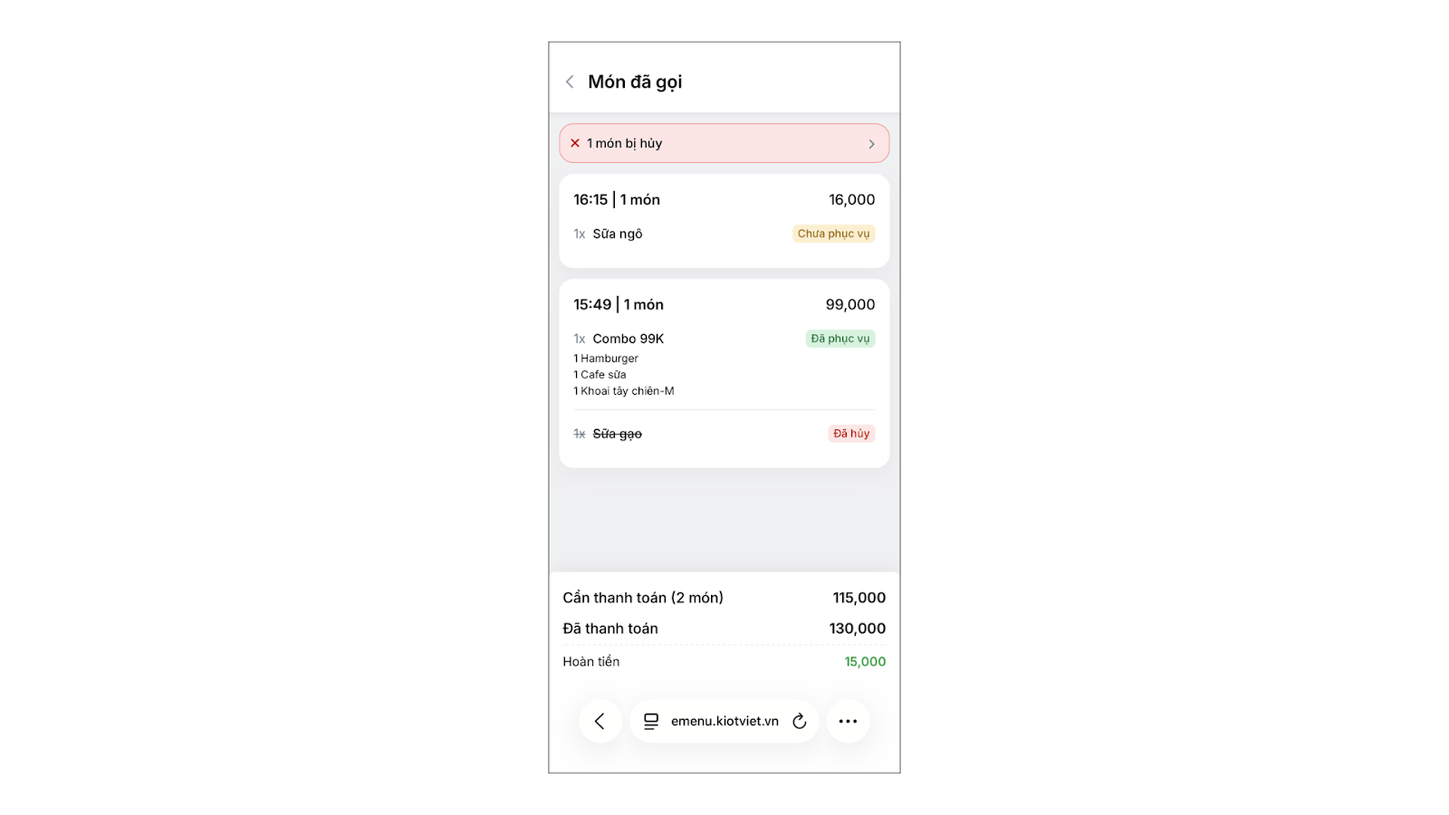 Với đơn đã thanh toán trước nhưng sau đó phát sinh món bị hủy, hệ thống sẽ hiển thị thông tin hoàn tiền tương ứng. Khách hàng liên hệ thu ngân để nhận lại khoản tiền này.