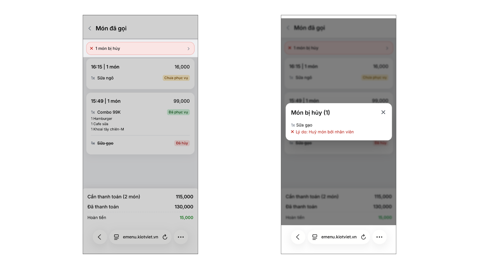 - Đã hủy: Món đã bị hủy. Khách hàng nhấn vào thông báo để xem danh sách và lý do.