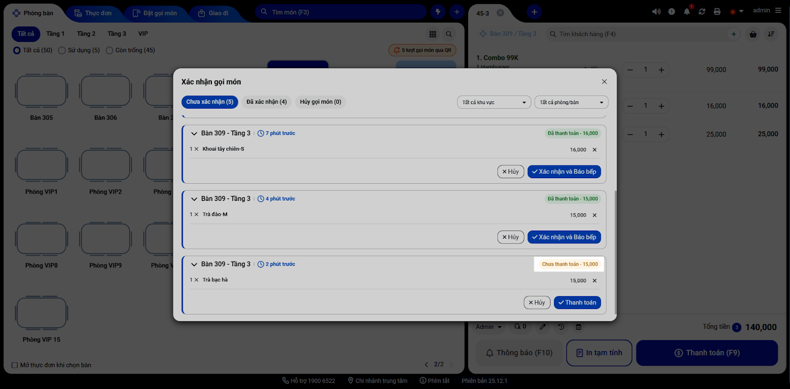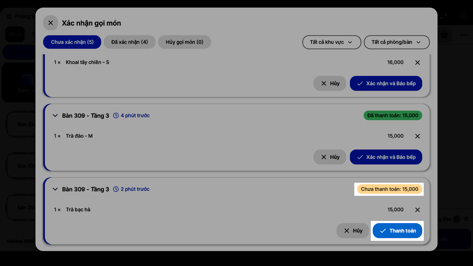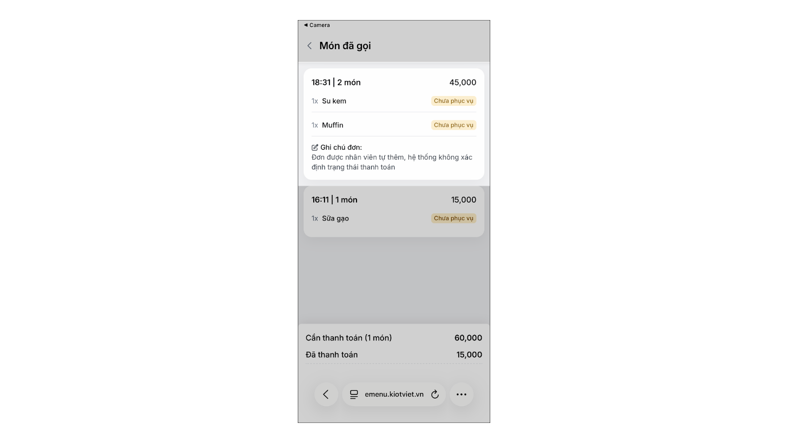 - Lượt gọi món này sẽ hiển thị kèm cảnh báo Chưa thanh toán – {Số tiền}.