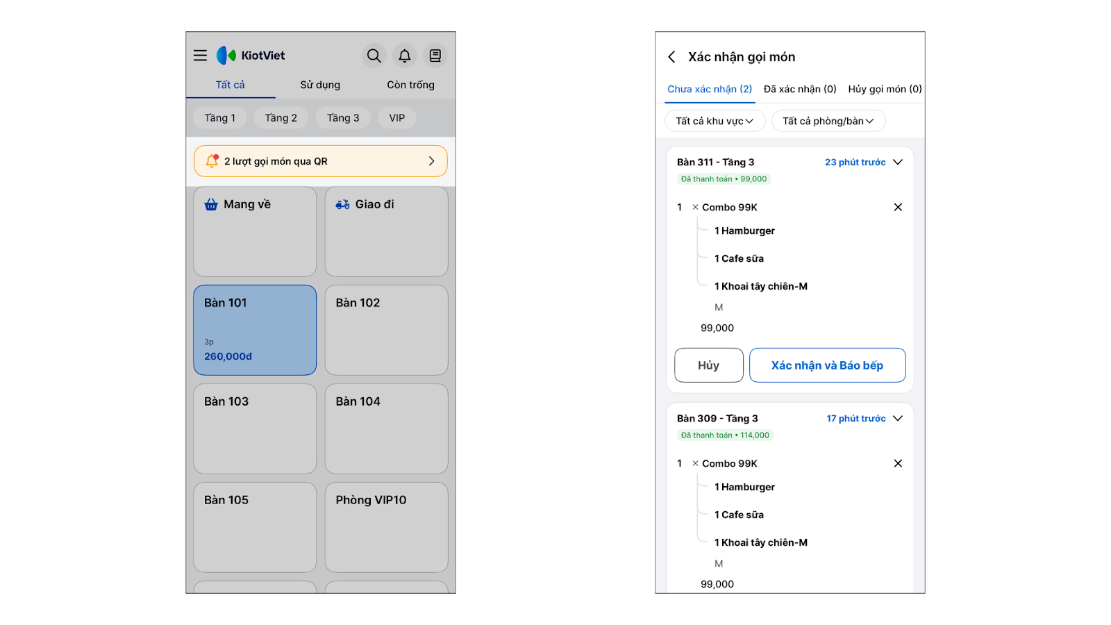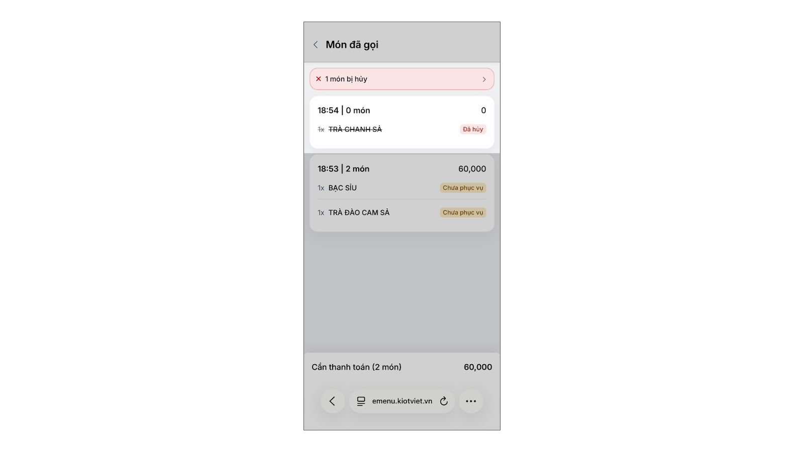 - Nếu bàn đang có đơn cũ: Các món trong lượt gọi mới này chuyển sang trạng thái Đã hủy.