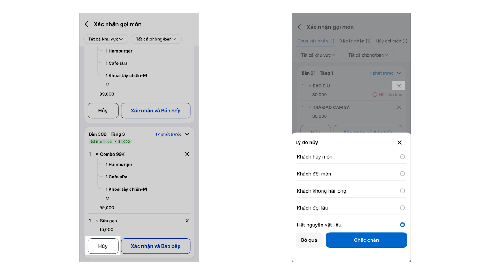 - Hủy toàn bộ: Nhấn nút Hủy để từ chối cả lượt gọi món này → chọn Lý do hủy → nhấn Xác nhận hủy.
